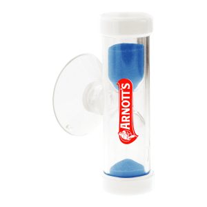 Five minute sand timer with a suction cup on the back that allows the timer to be attached to many surfaces.