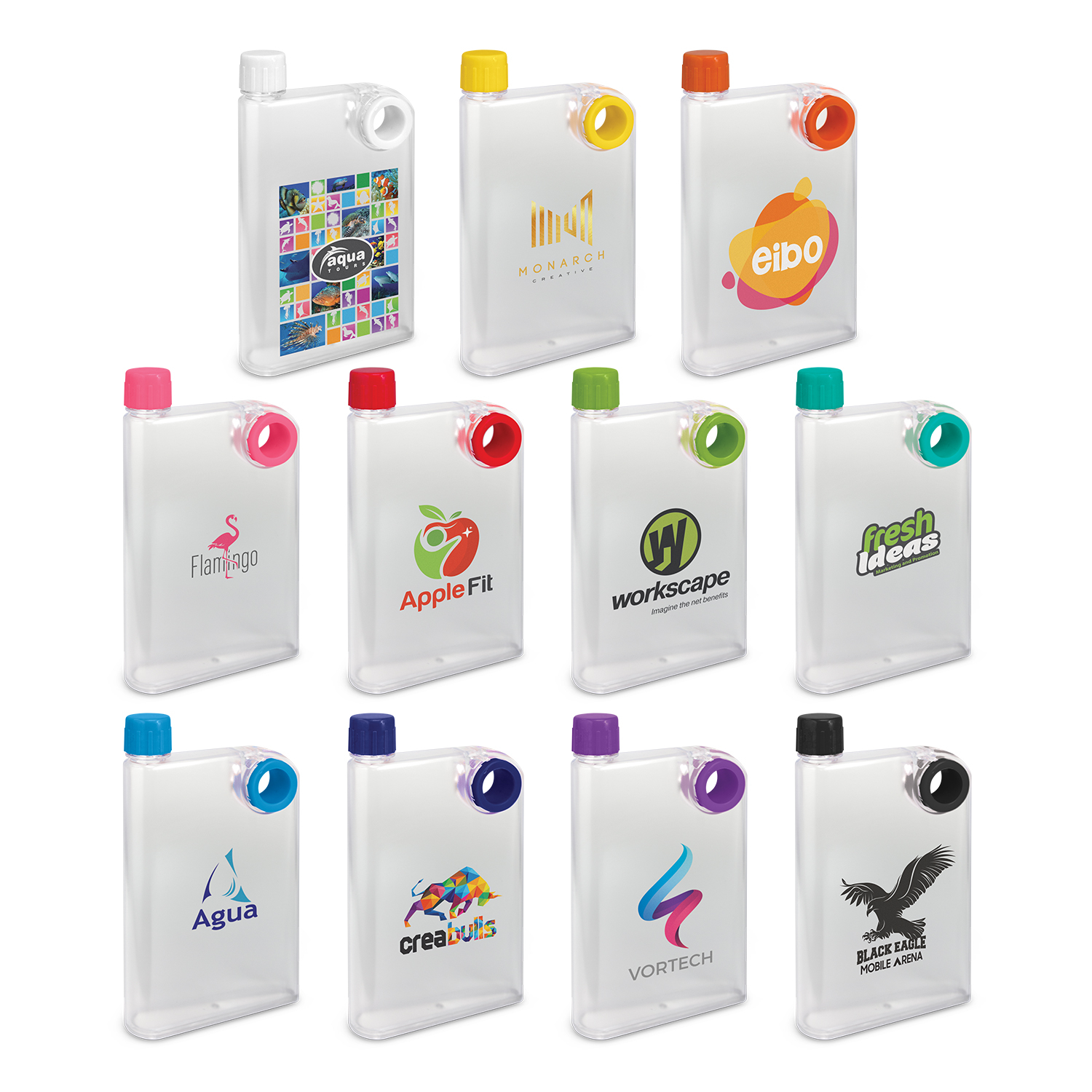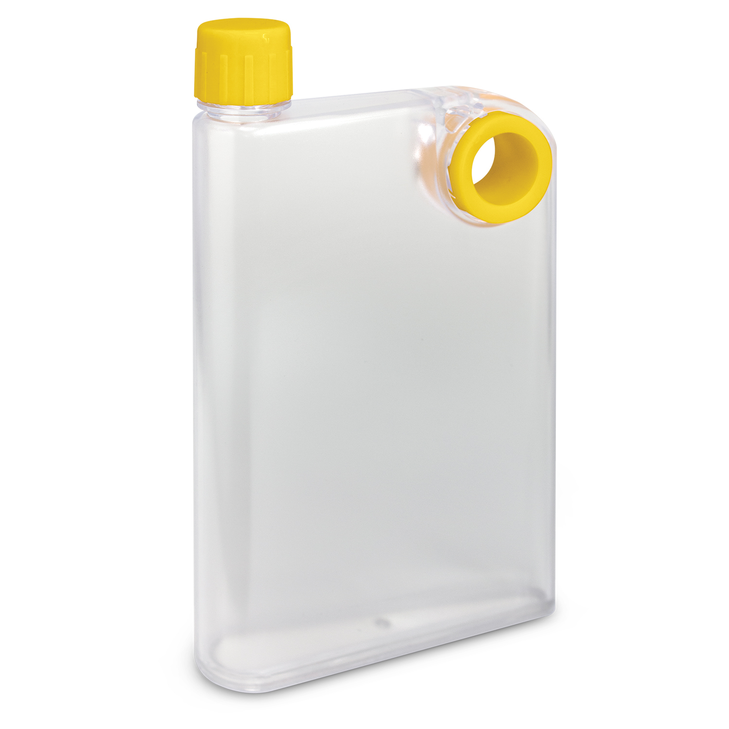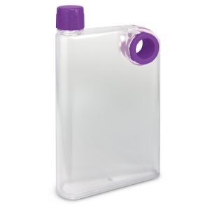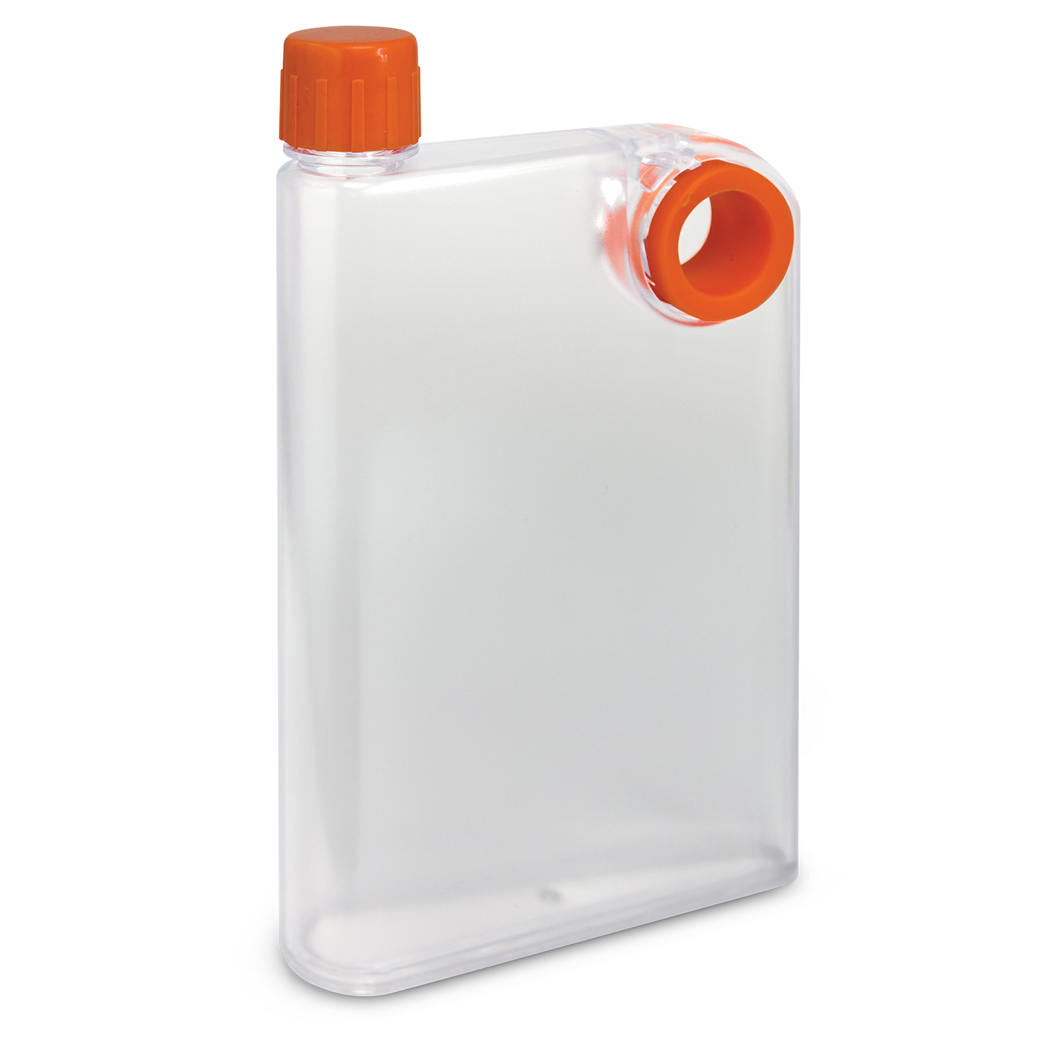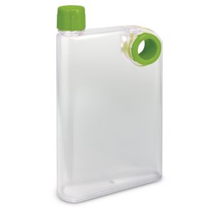 Futuristic 400ml notebook-shaped water bottle which bevelled so it is easy to carry. It easily slides into bags alongside books, laptops and folders. It has a secure screw on lid and a handy finger grip with a soft-touch silicone liner. It is manufactured from AS plastic with a polypropylene lid. This product is not dishwasher safe and handwashing is recommended.