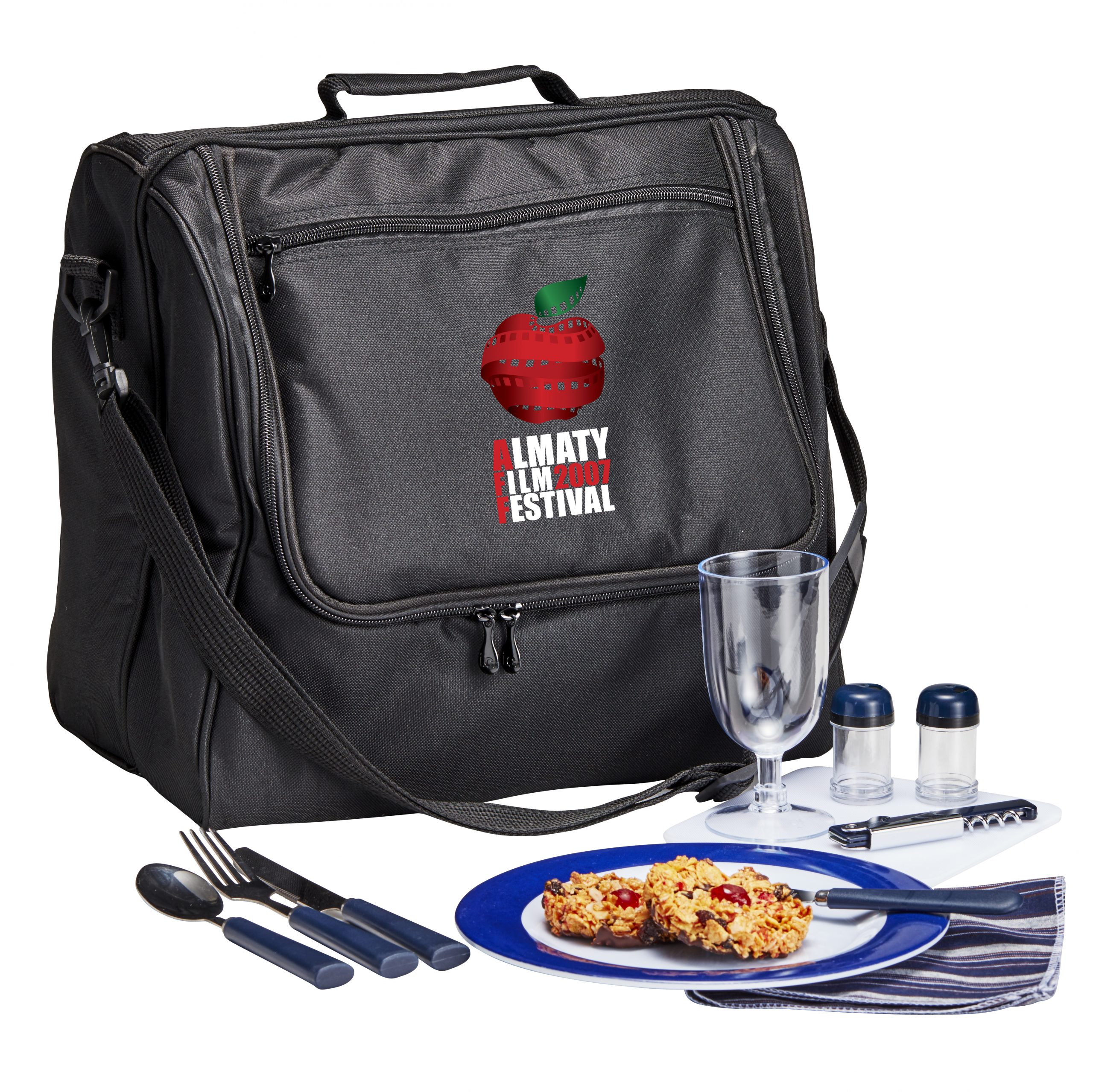 600D polypropylene 4 person setting (4 Spoons/Knives/Forks/Plates/Plastic Wine Glasses/Cotton Napkins, 2 Salt & Pepper Shakers, 1 Cutting Board, 1 Cheese Knife, 1 Bottle Opener). Picnic/cooler bag with large capacity cooler compartment and foil insulation. Supplied in polybag.