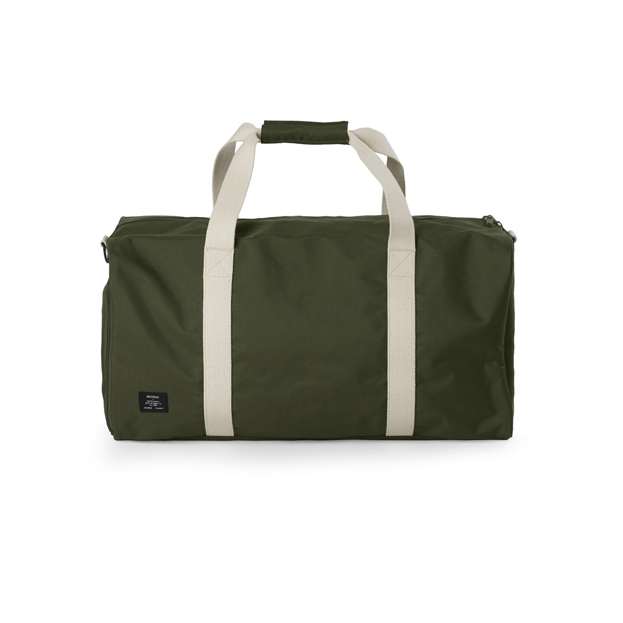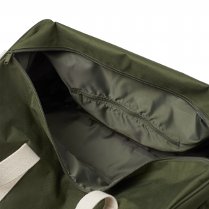 One large main compartment, one external zipped shoe compartment, YKK tonal nylon zip, reinforced cotton adjustable shoulder strap and handles