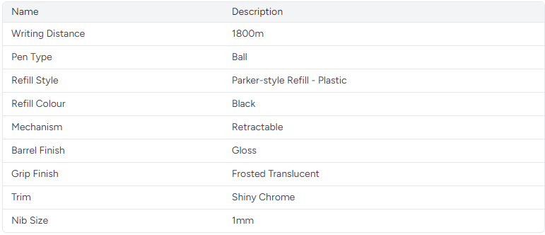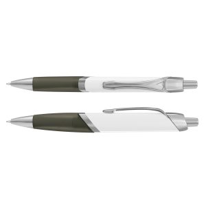 Retractable plastic ballpoint pen with a white barrel, a frosted translucent soft-touch grip and shiny chrome trim. It can be branded in stunning full colour on both sides of the barrel. Avenger has a black large volume refill with 1800 metres of German manufactured Dokumental ink.