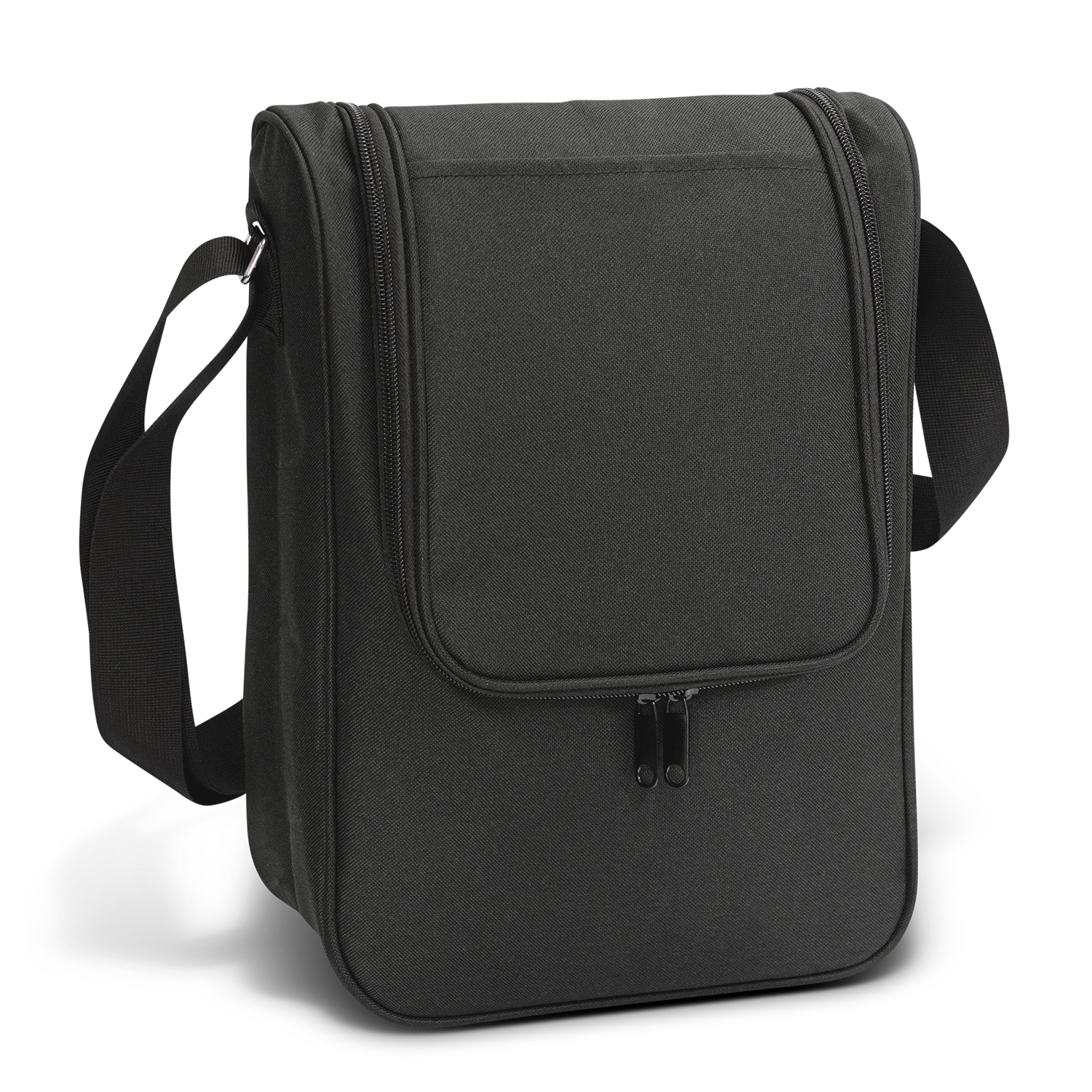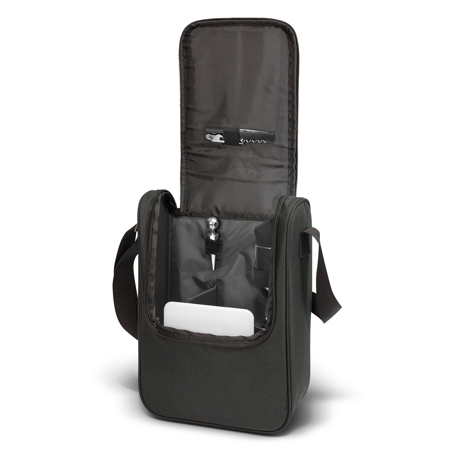 Premium picnic set which is perfect for wine and cheese connoisseurs who love the outdoors. It is manufactured from strong 600D polyester with an easy-clean lining. Bordeaux has a large zippered main compartment, an internal slip pocket, an external slip pocket and an adjustable woven shoulder strap with silver metal buckles. The picnic set includes two acrylic glasses, two black cotton napkins, a bottle opener, a wine stopper, a cheese board and room for two bottles of wine with a padded divider.