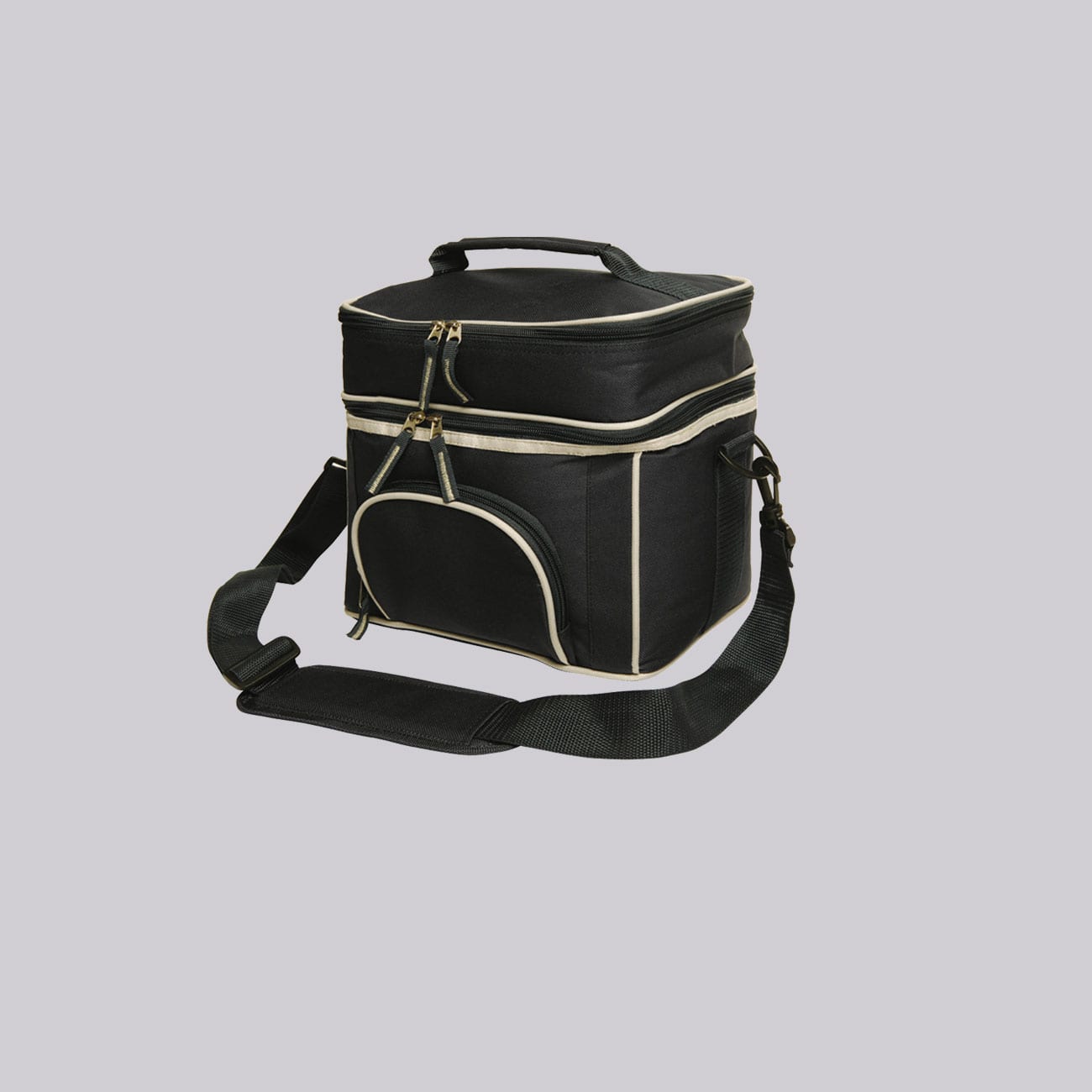 Insulated cooler. Double-zippered compartments. Adjustable shoulder strap.