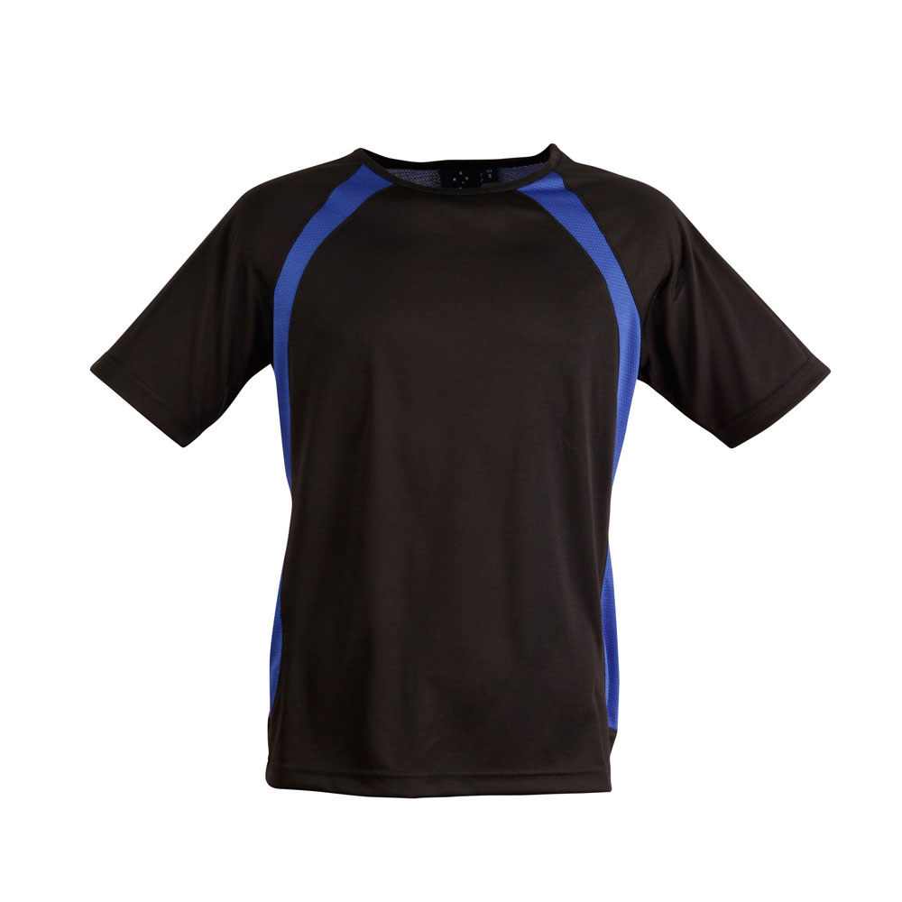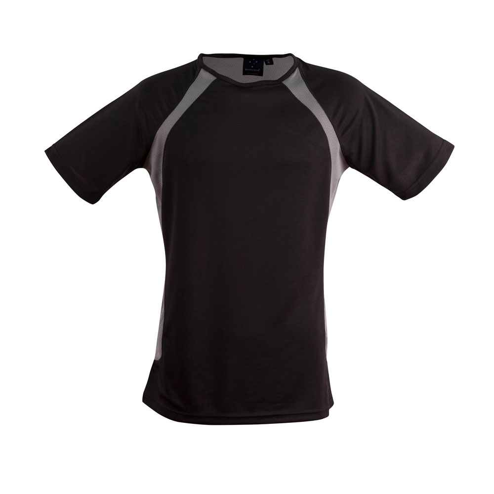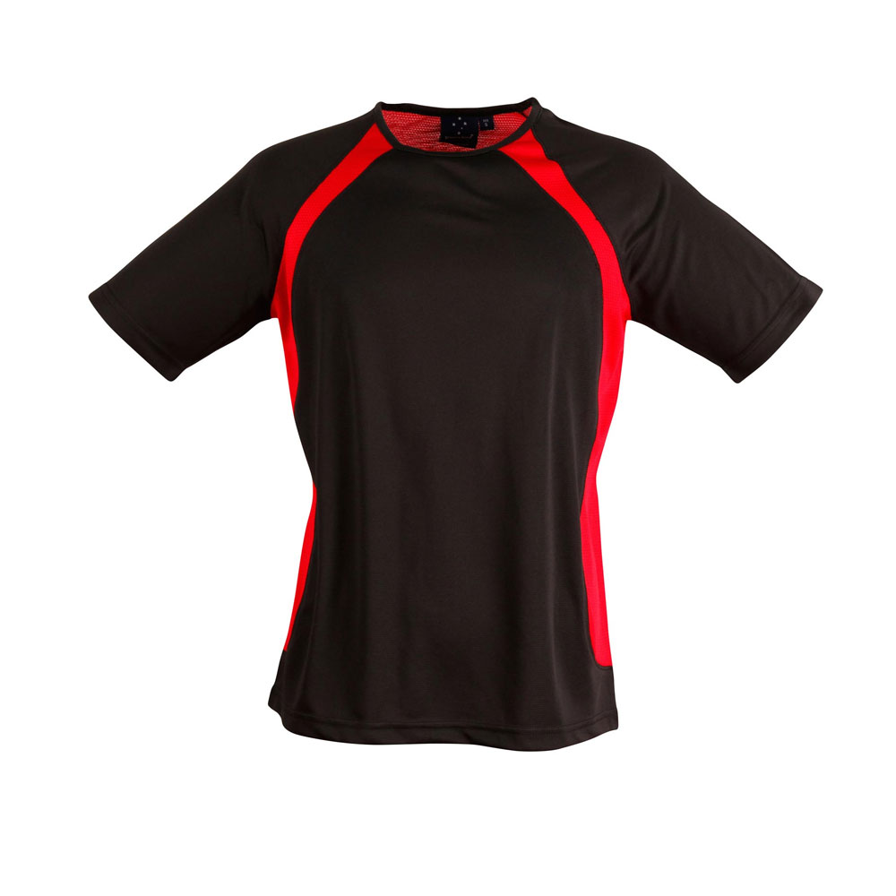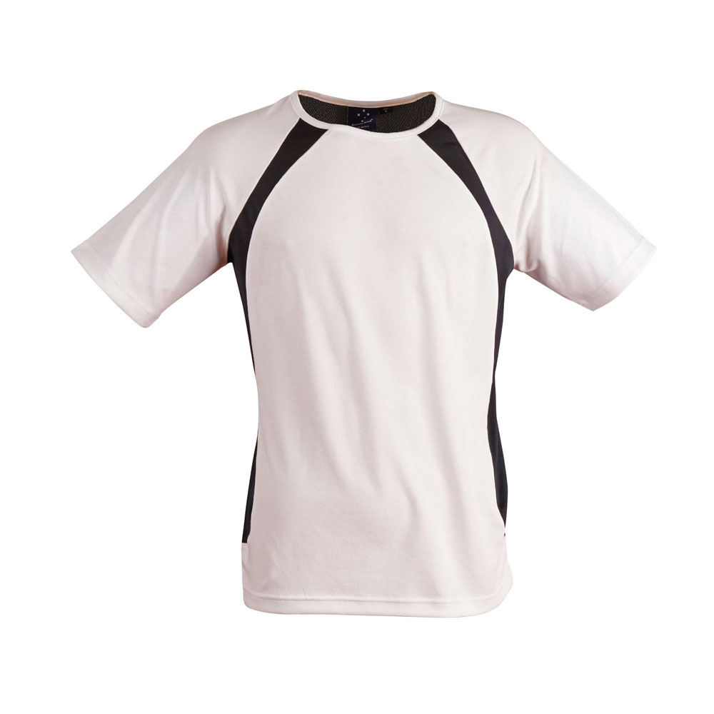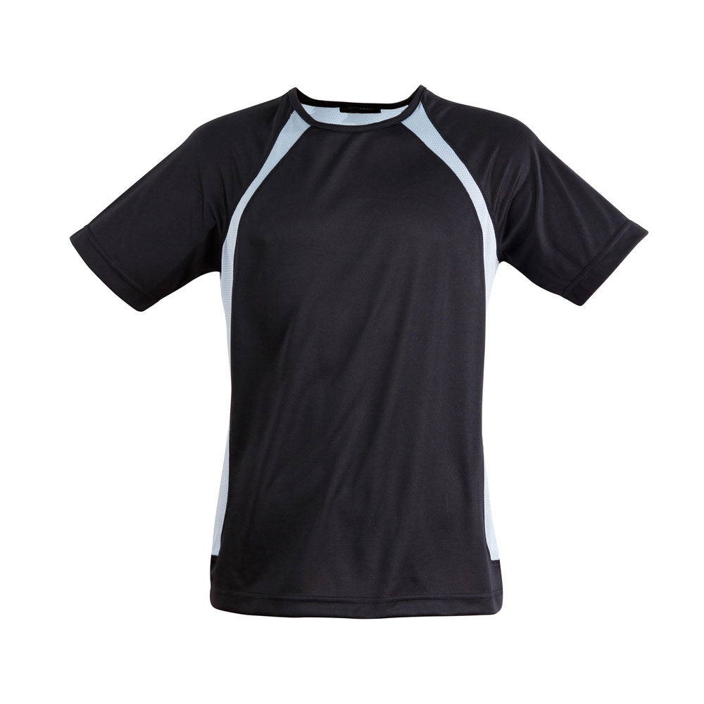 Moisture management fabric. Ultralight mesh in contrast contoured side panels for ventilation. Excellent fit and comfort for athletes.