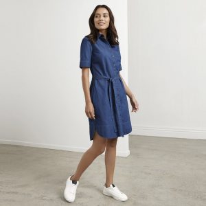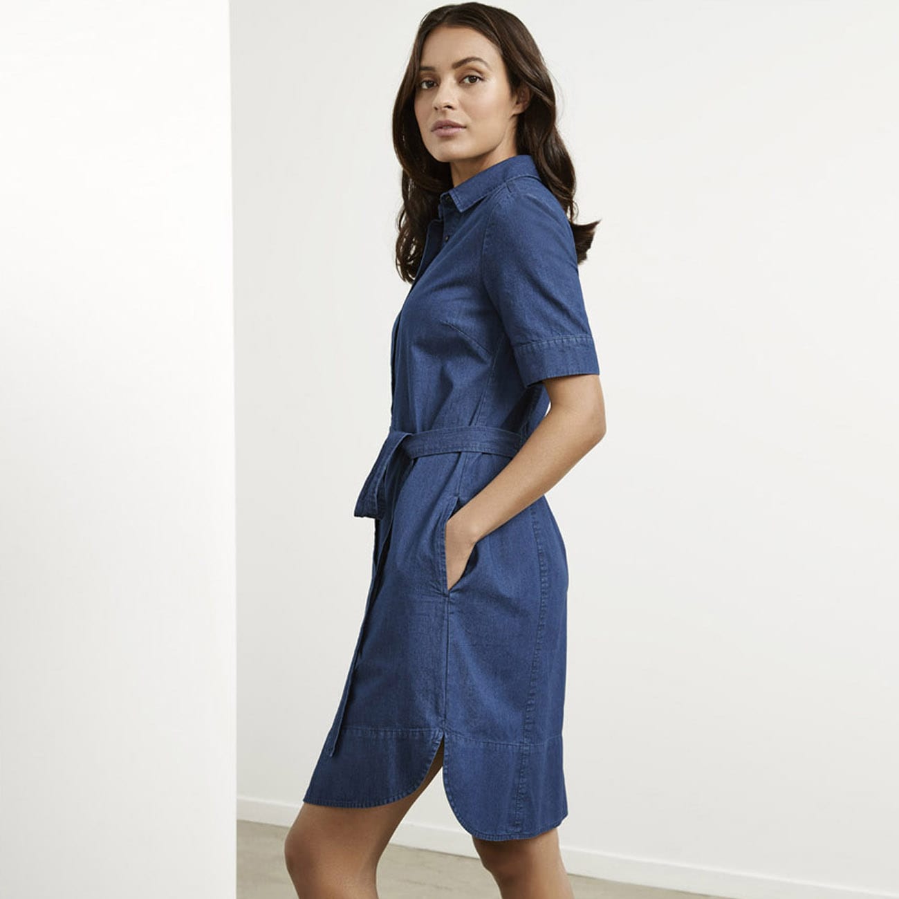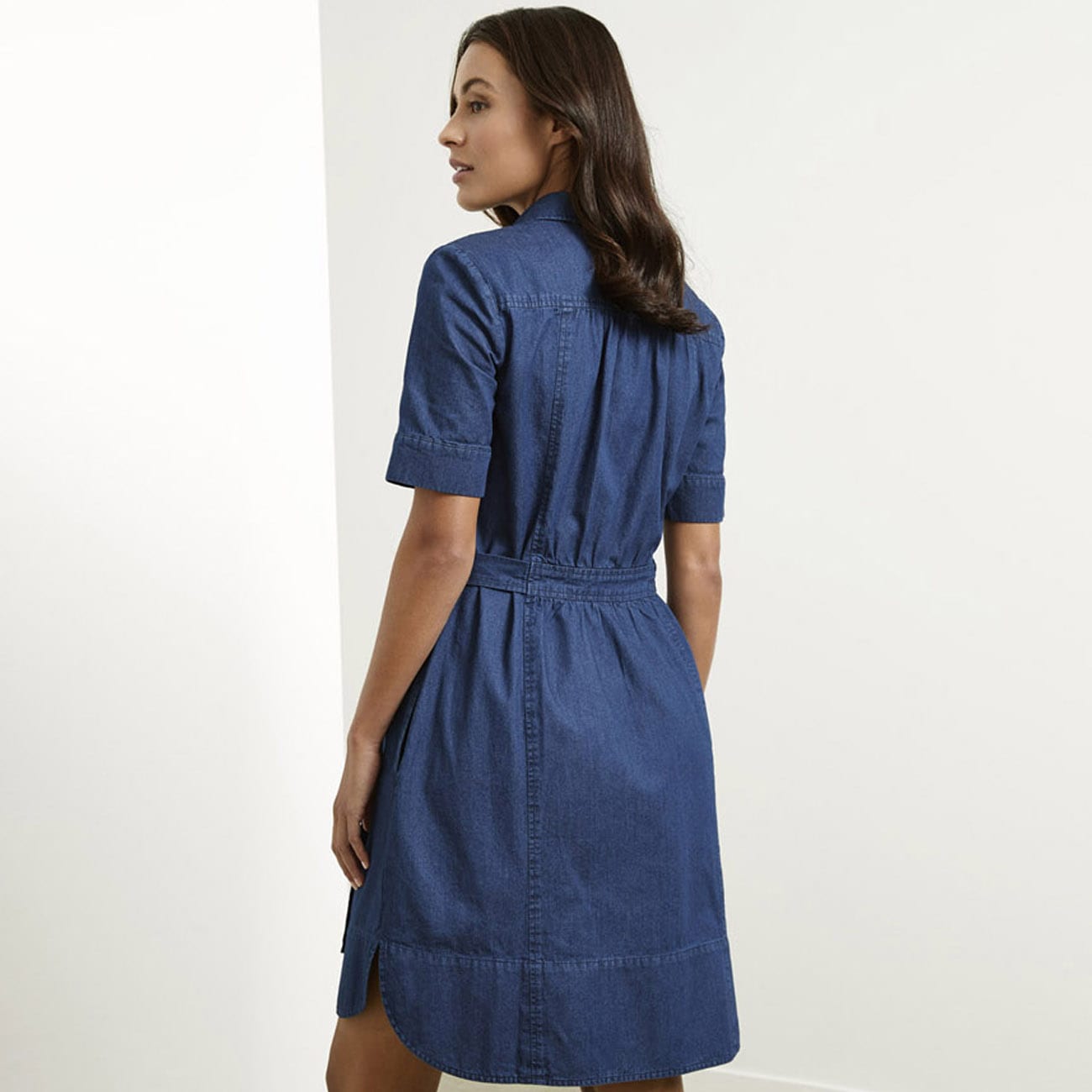 Button-through dress with attached waist tie for personalized shape definition