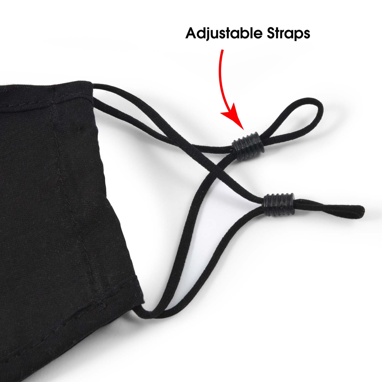 - Each mask features 3 Black layers of cotton and for an extra comfortable fit two black elastic over ear straps are adjustable in length using a simple slide mechanism.