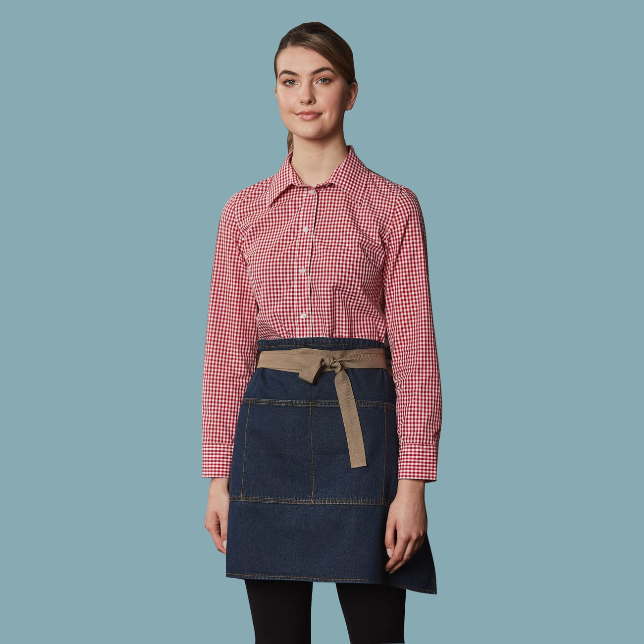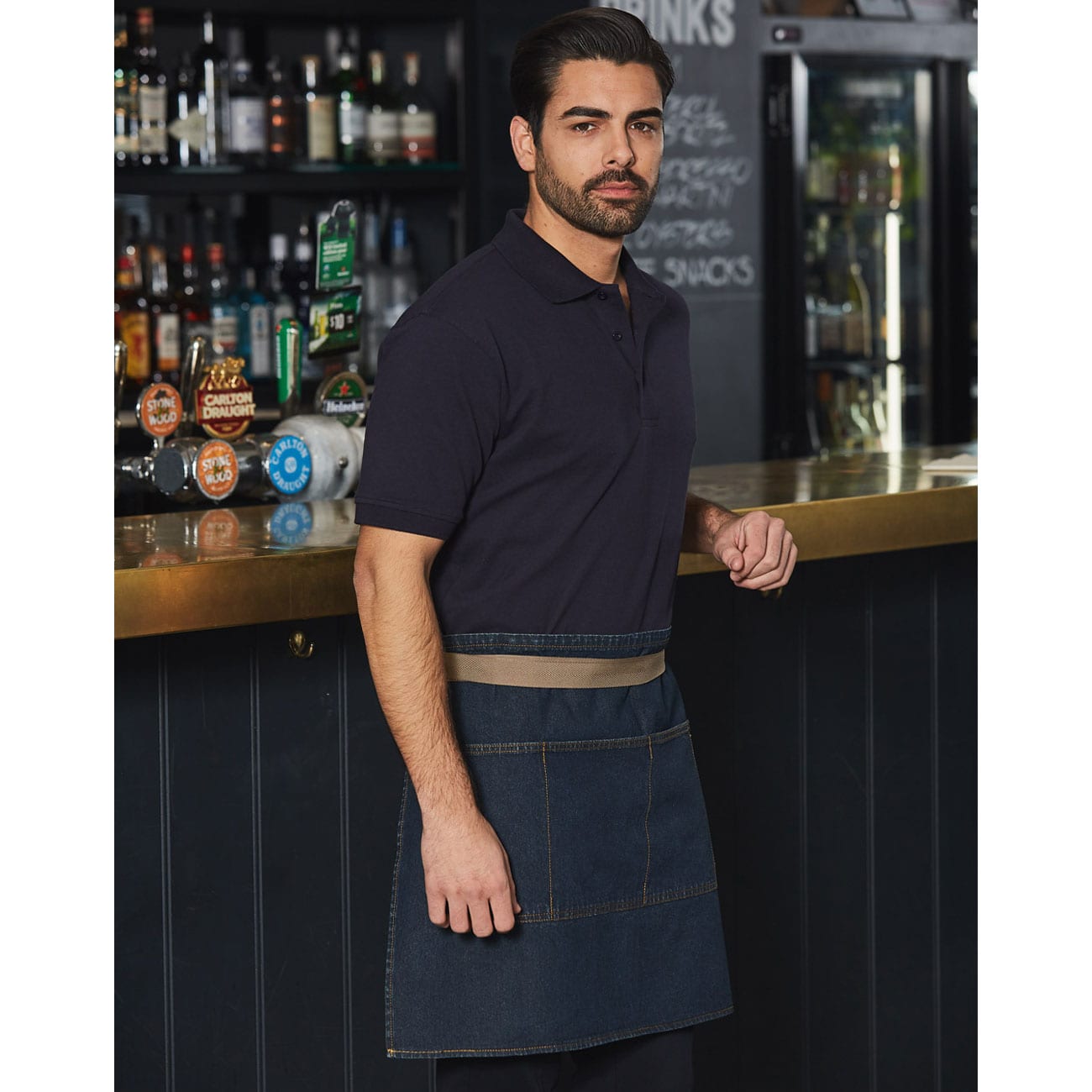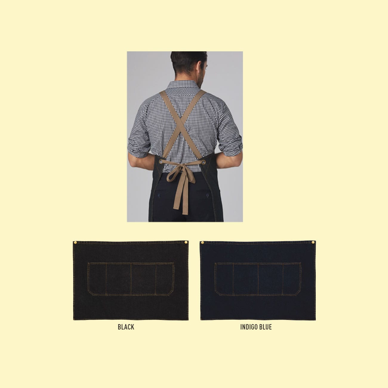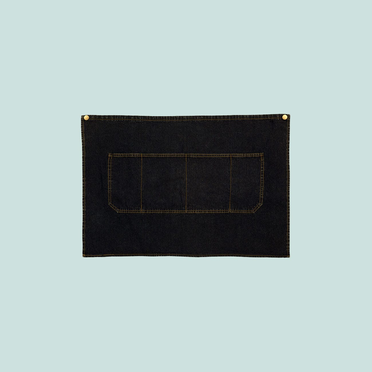 Half waist Denim Apron with antique studs, contrast denim stitching. Apron includes 4 front pockets.