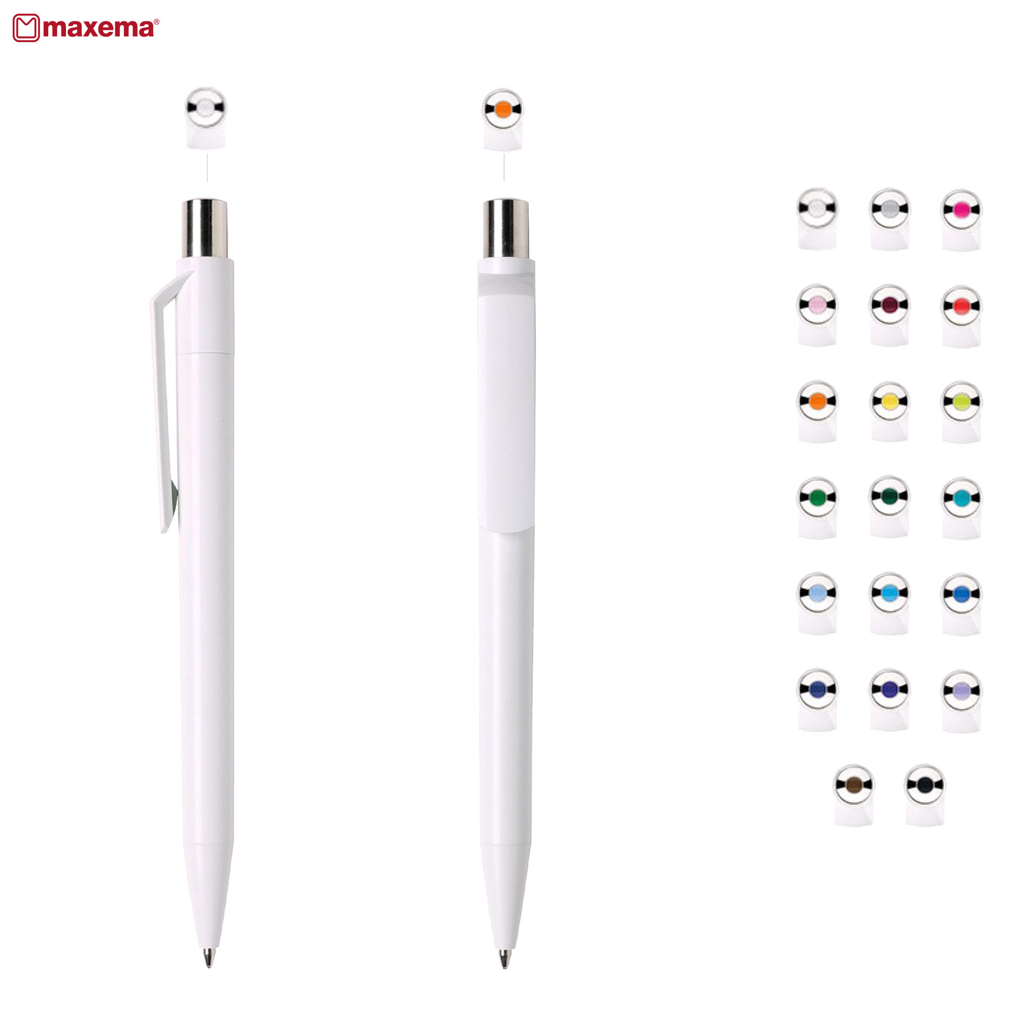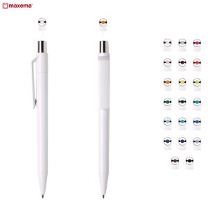 - Retractable with return spring, white barrel with white clip and chromed push button