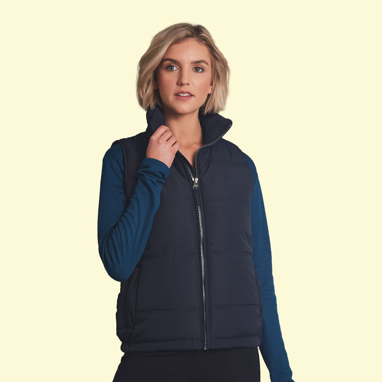 Inner pocket on left chest. Inner bottom zip for embroidery.