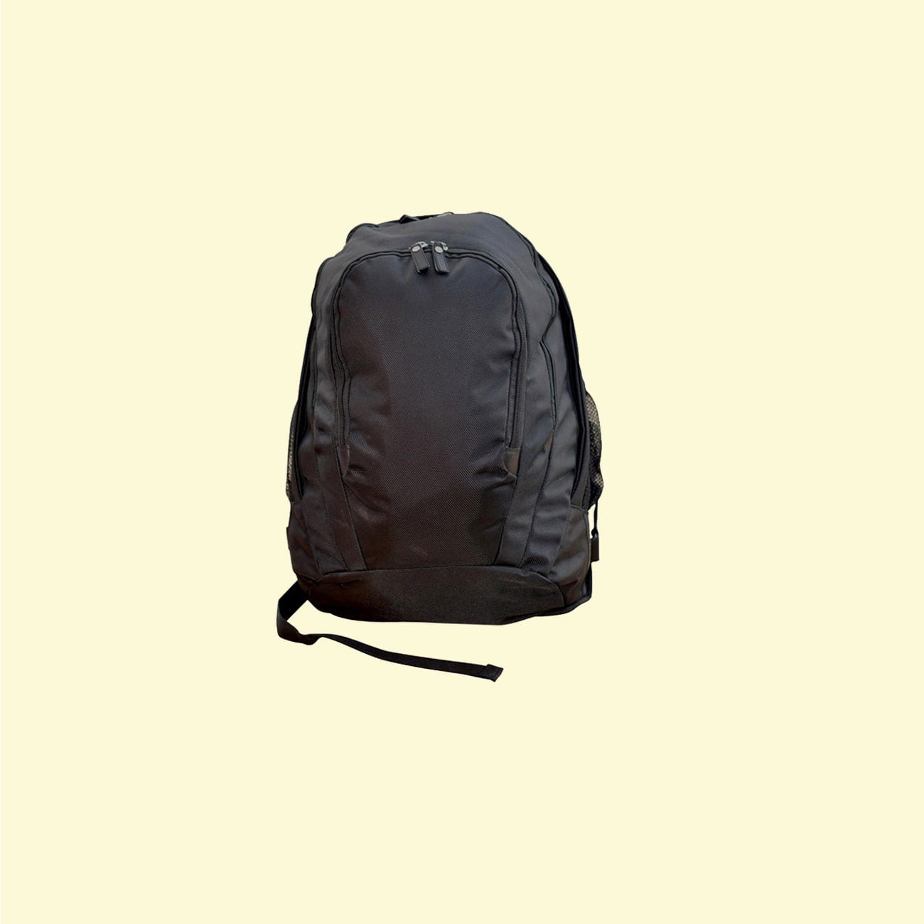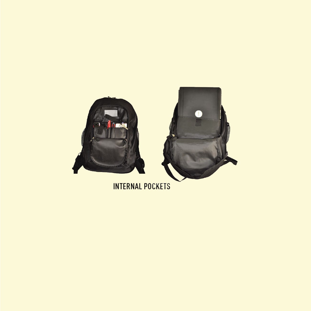 Elastic mesh slip pockets on both sides. Padded air mesh back panels and straps.