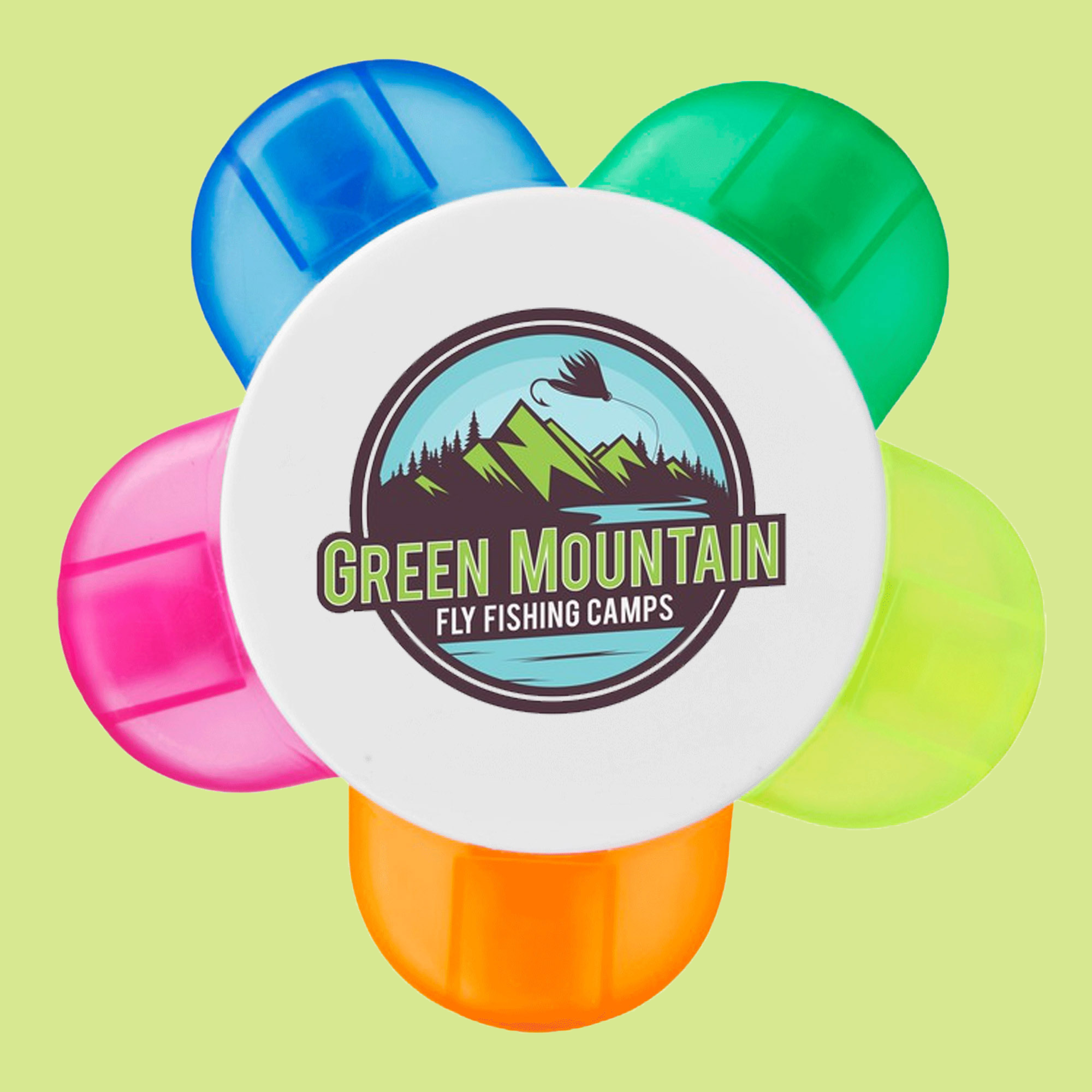 - A flower shaped highlighter with a set of orange, yellow, pink, green and blue highlighters, each colour point covered by a coloured transparent plastic cap.