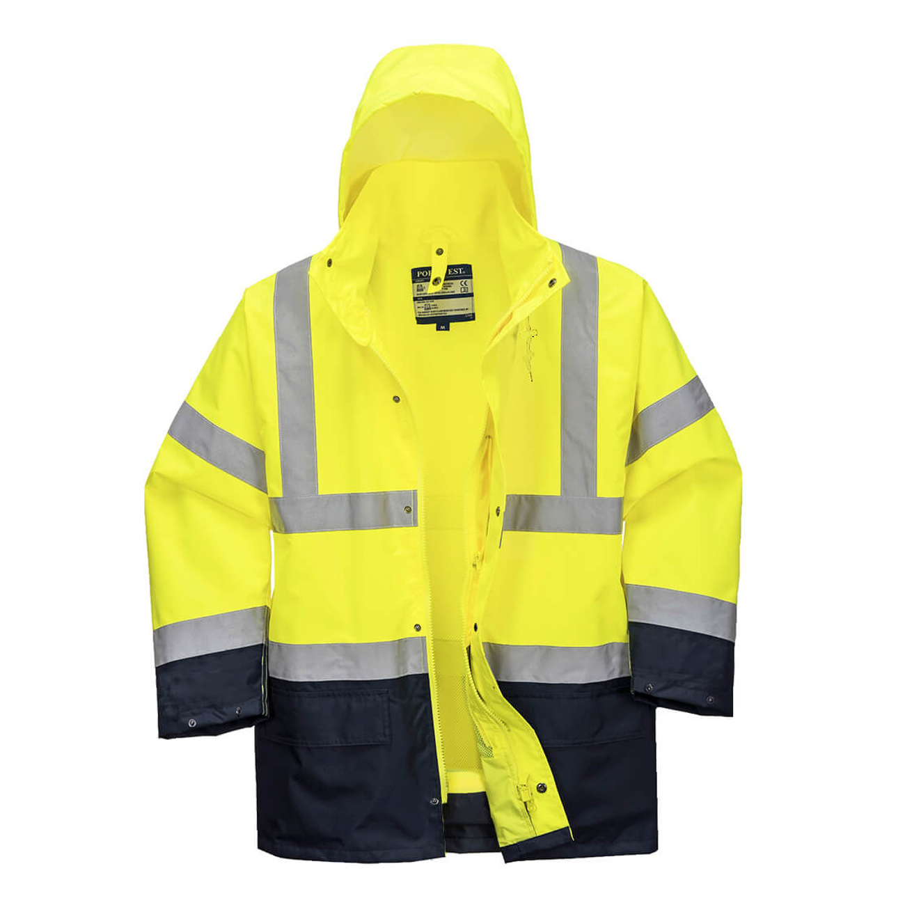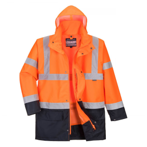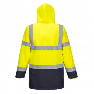 An adaptable, functional style offering excellent value for money. Outer jacket contains two useful large patch pockets with stud adjustable cuffs and a concealed adjustable hood, whilst the inner waterproof jacket has detachable fluorescent fleece sleeves, 2 spacious side pockets and has dark contrast panels for protection against dirt.
