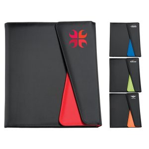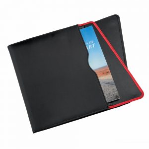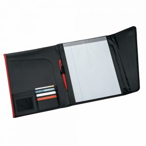 - 190T Polyester tri-folder with separate front pocket for document storage, internal business card pockets, pen loop and A4 lined notepad.