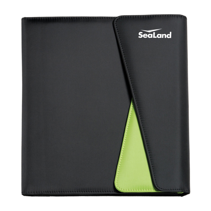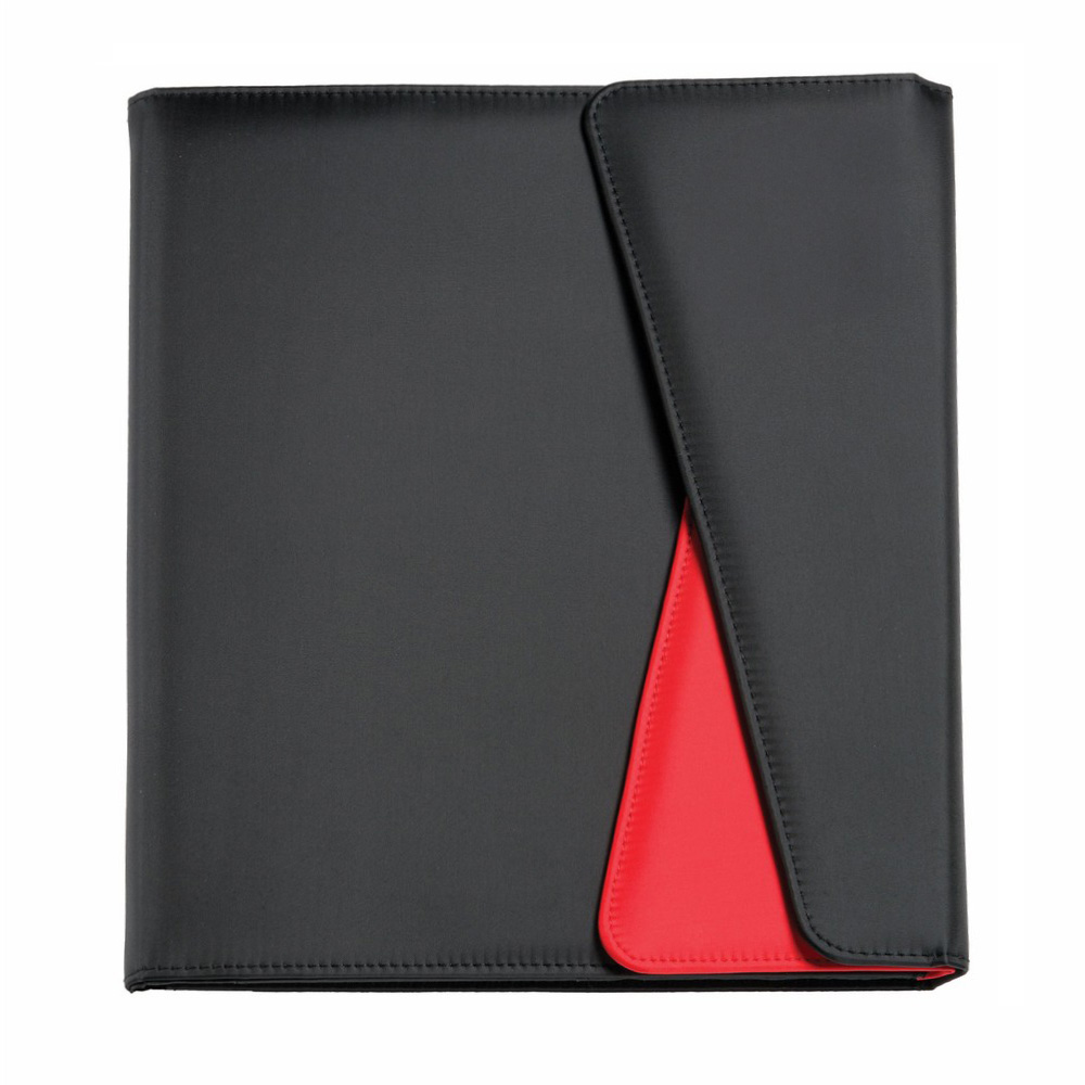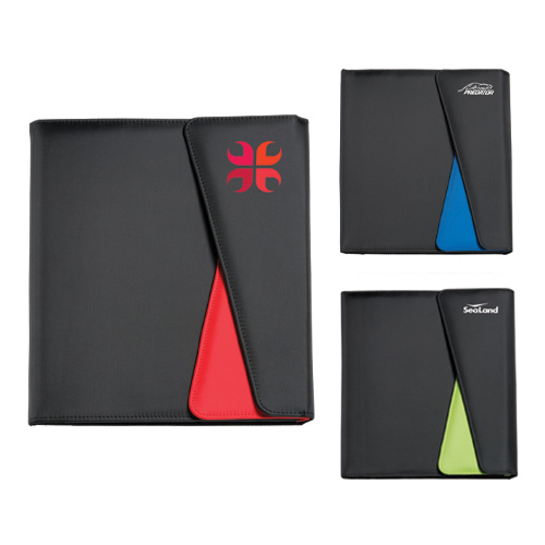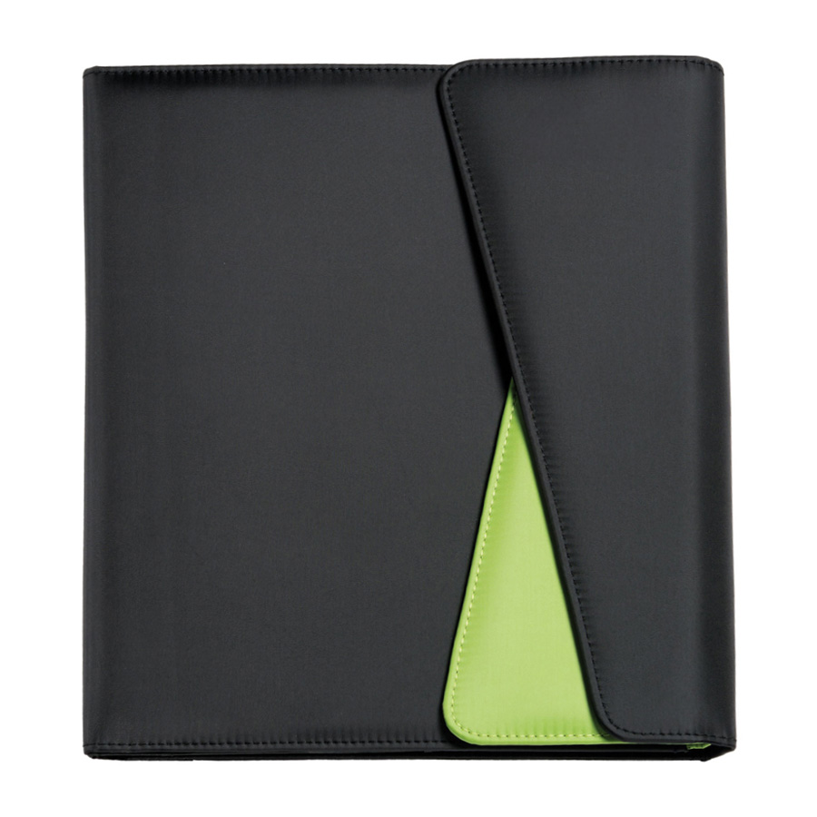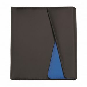 190T Polyester tri-folder with separate front pocket for document storage, internal business card pockets, pen loop and A4 lined notepad. Both compartments with magnetic closures.