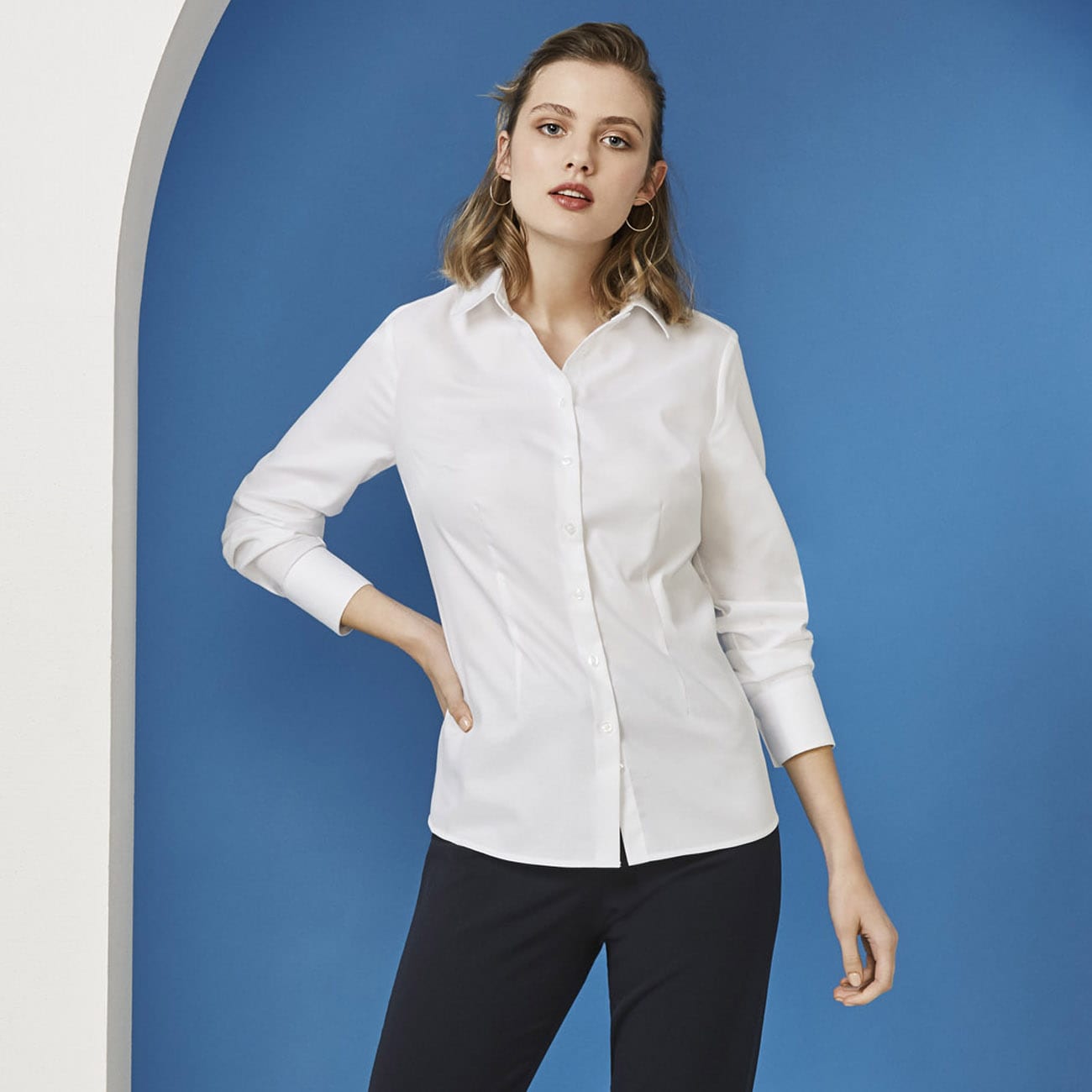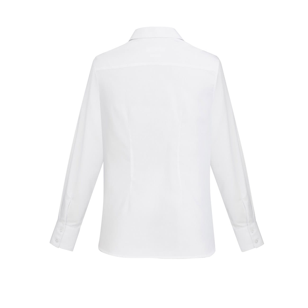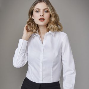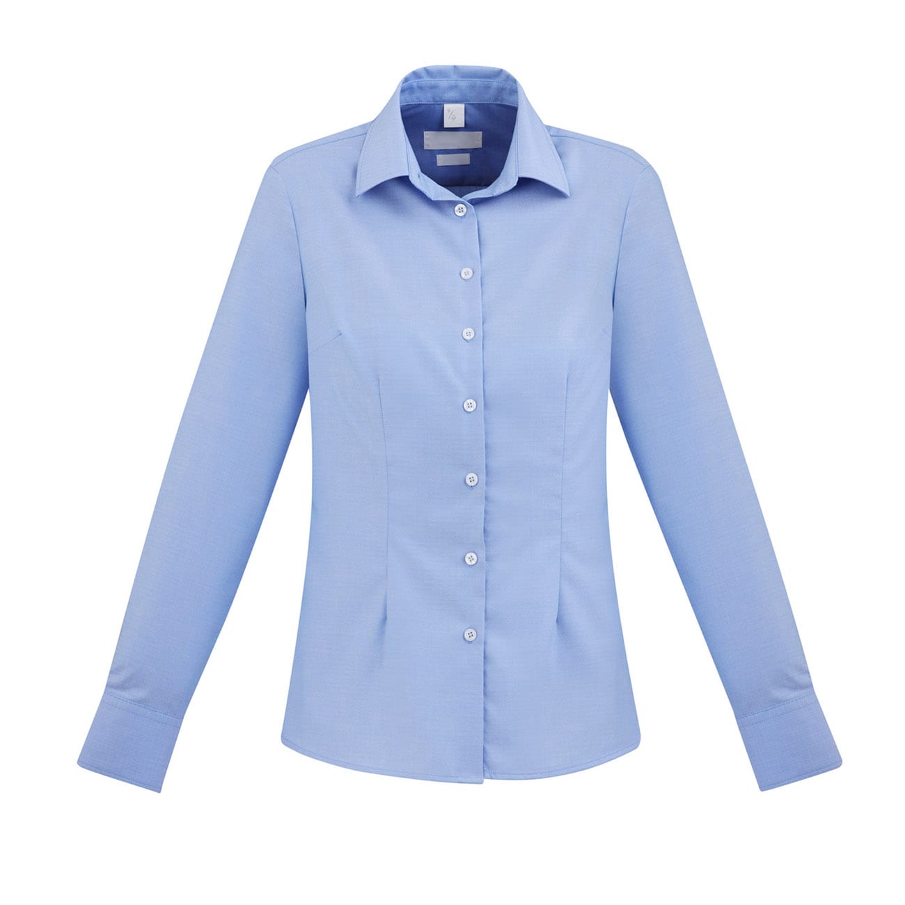 Ladies features bust darts, waist shaping and neatly finished placket