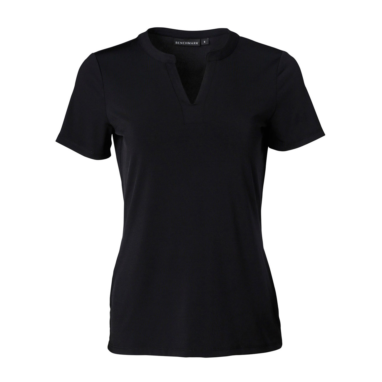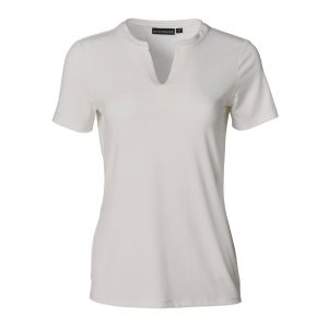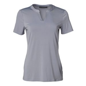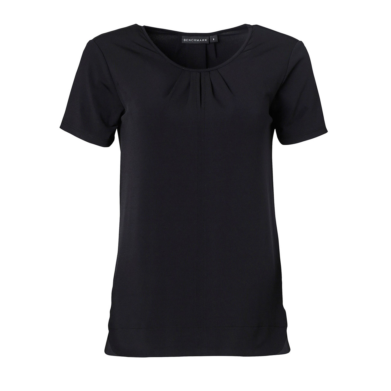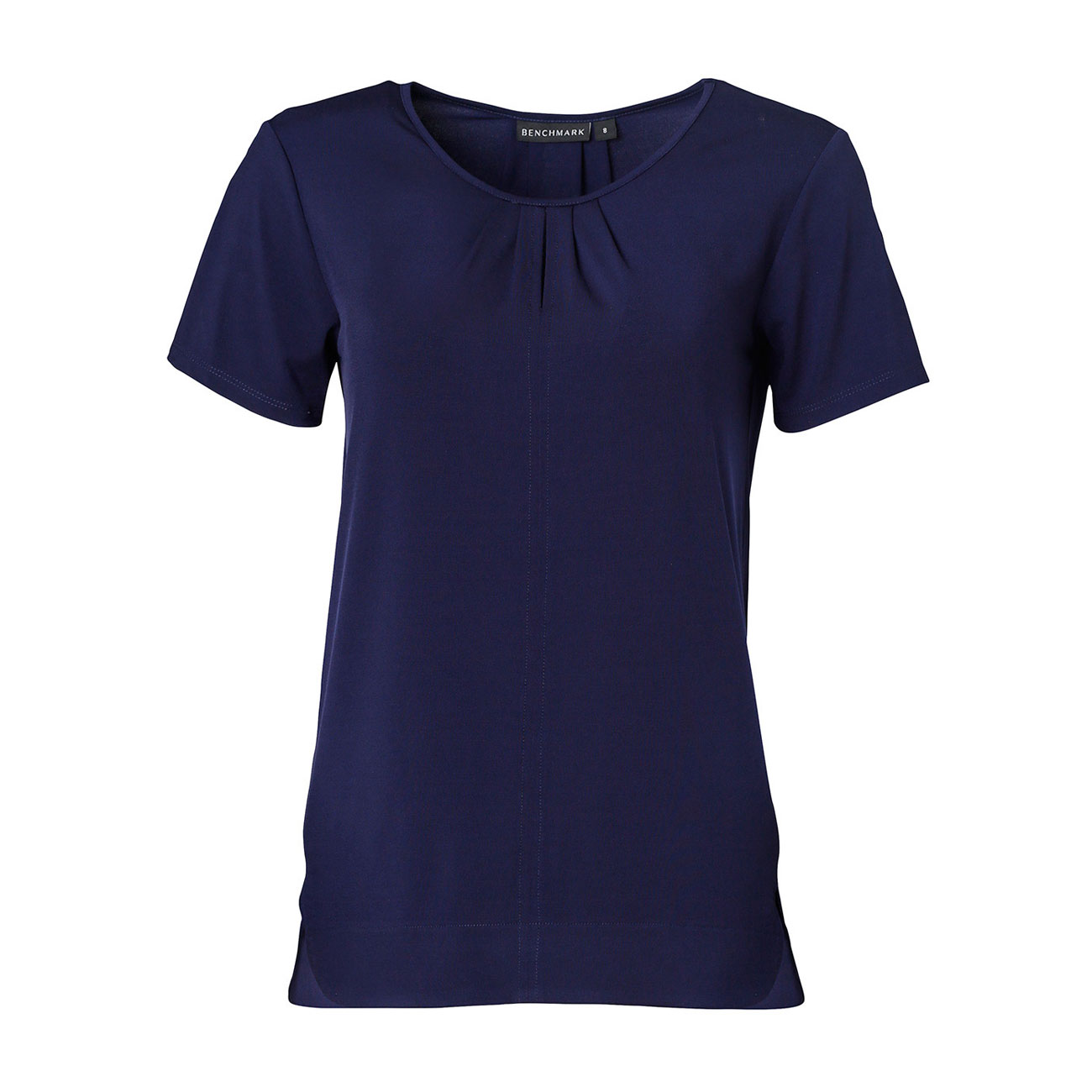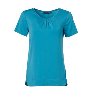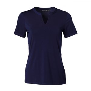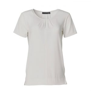 95% Polyester / 5% Elastane. The Sofia is a short sleeve knit top with a formed round neck and inset v-neck tab.