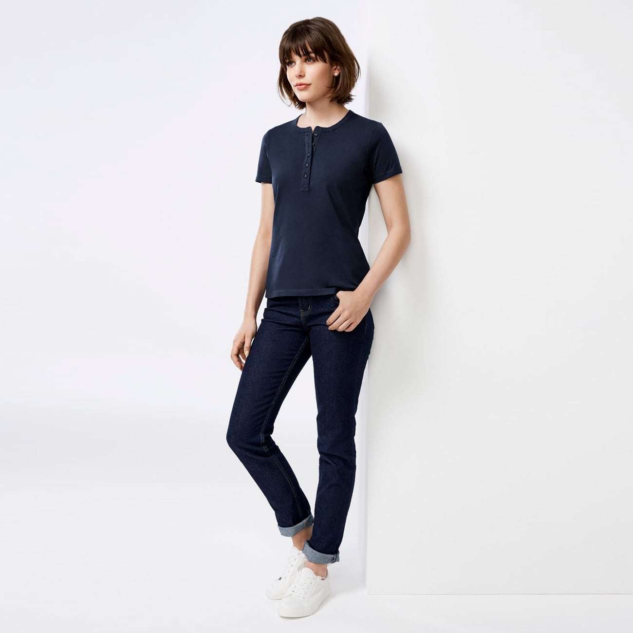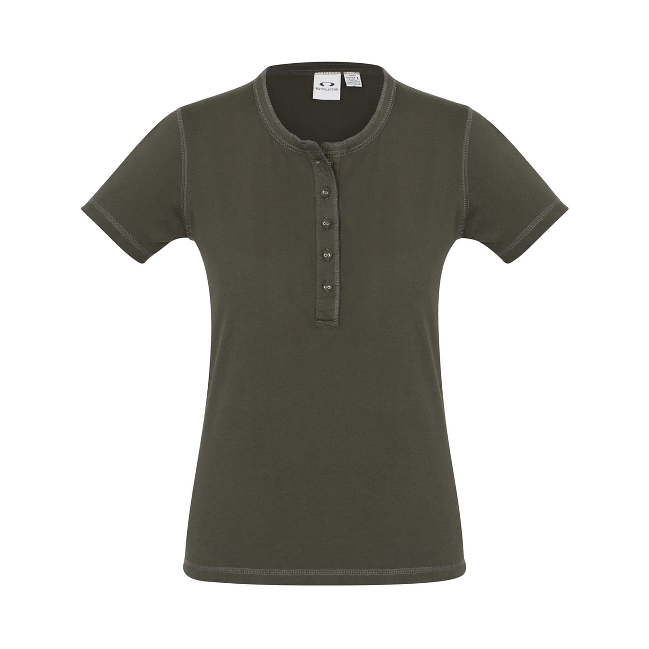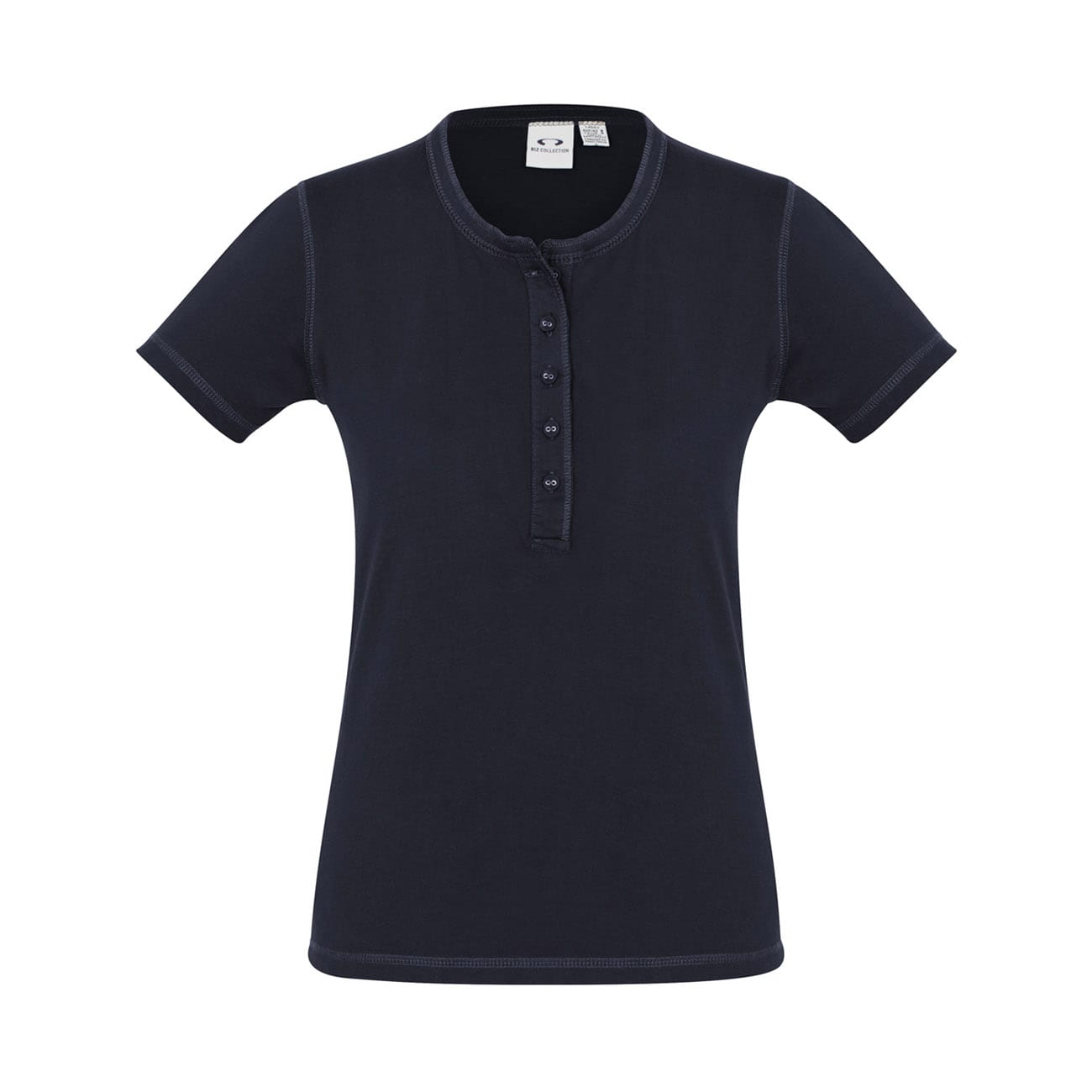 Henley style placket with fabric covered fish-eye buttons