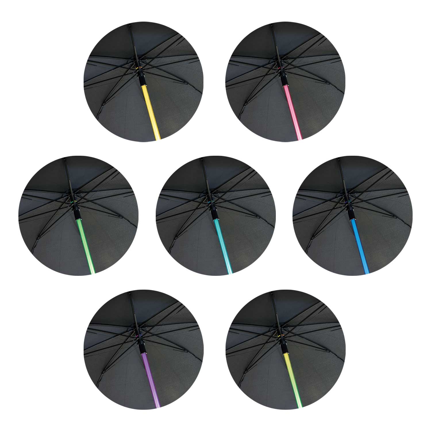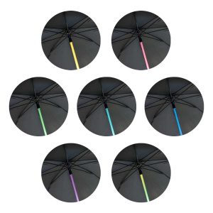 Stay dry and safe anywhere in the universe with the Light Sabre Umbrella. This futuristic safety umbrella has a super bright LED shaft which lights up with multiple colours at night to ensure the user can be seen. It also features a handy torch in the base of the comfortable handle. The umbrella has an eight-panel, 190T showerproof polyester canopy with 58cm ribs. It has an eight-rib spring-loaded metal and fibreglass frame which prevents damage to the umbrella if it is blown inside out. Other features include smart gun metal tips, a Velcro tie and a slip on pongee carry sleeve. This product uses three AAA batteries which are included.