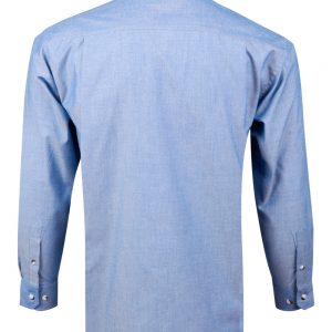Matching blue stitching Tortoiseshell buttons Wash ‘n’ wear design, button down collar on men’s shirt.
