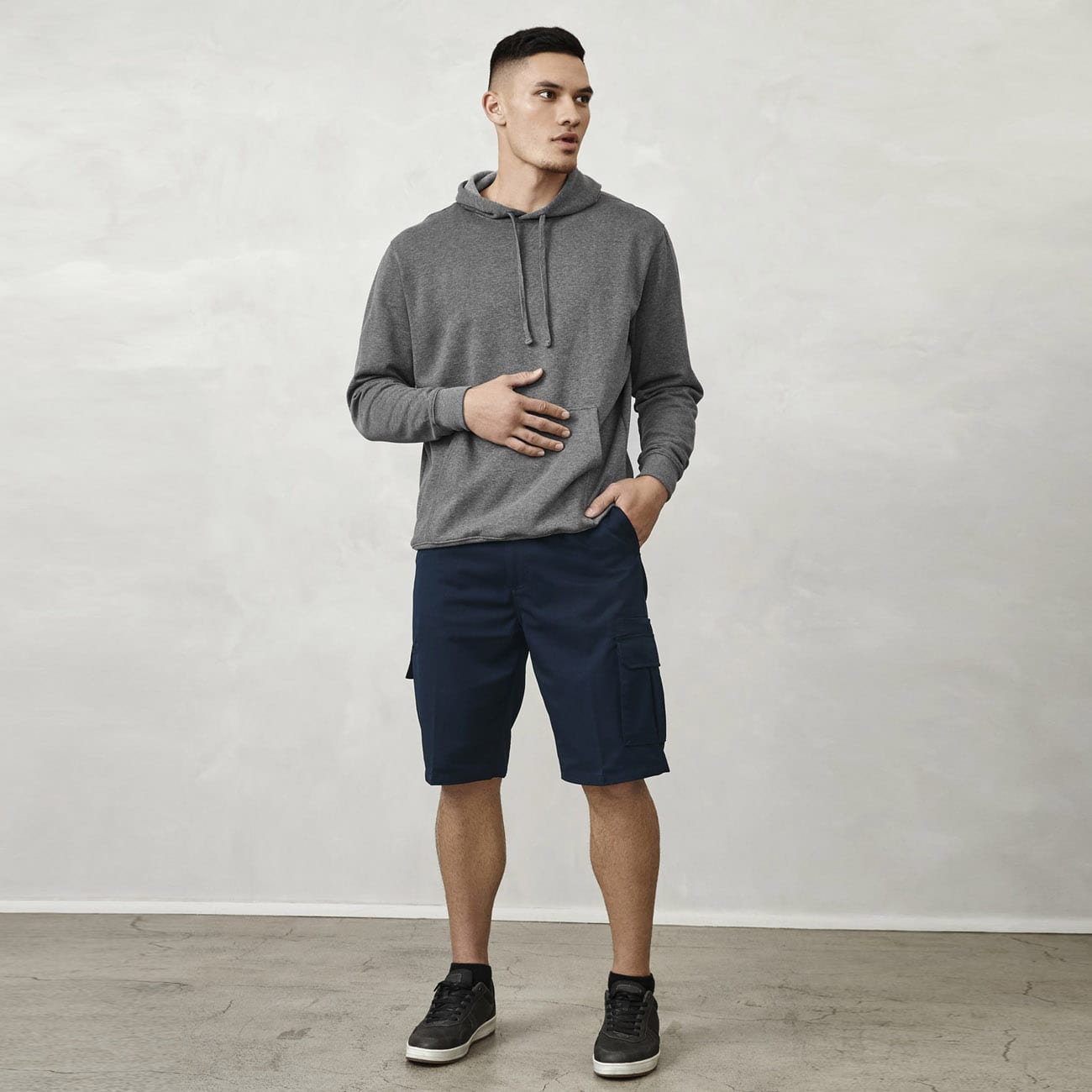 Flat front with side pockets, 2 rear pockets, 1 side cargo pocket and 1 side welt pocket
