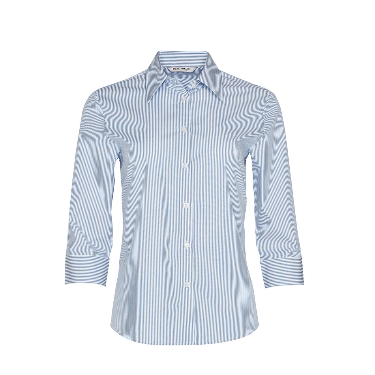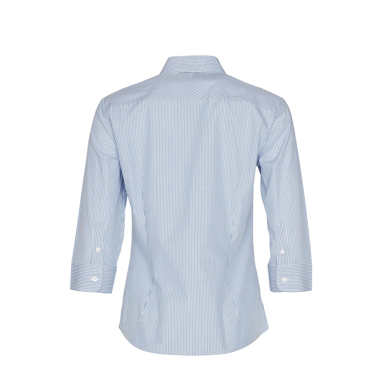 Ladies 3/4 sleeve have single-button round cuffs. Ladies short sleeve have action back.