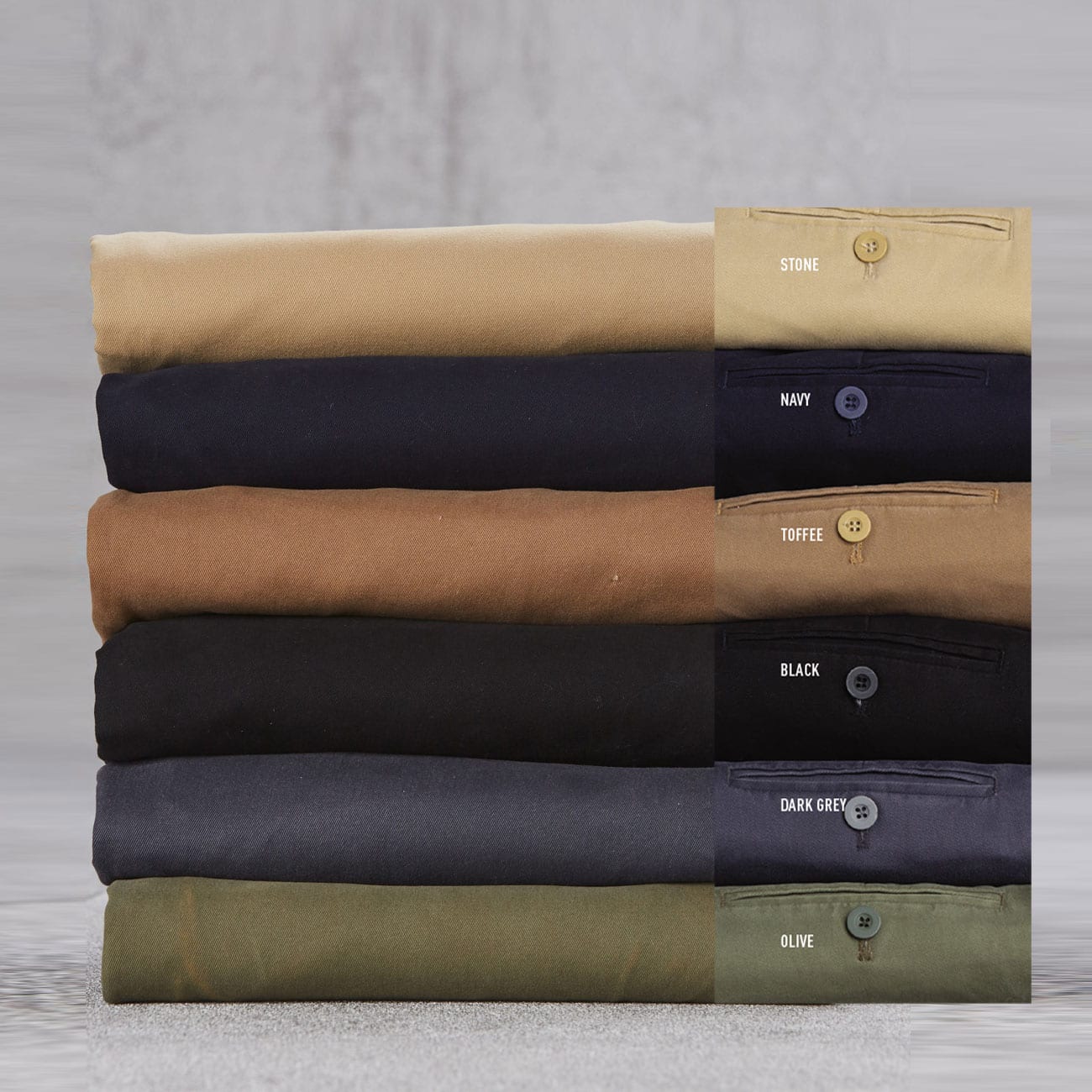 Boston stretch Chino range is a slim fit pant with 2 front slant pockets and 1 back pocket with a top stitched hem.