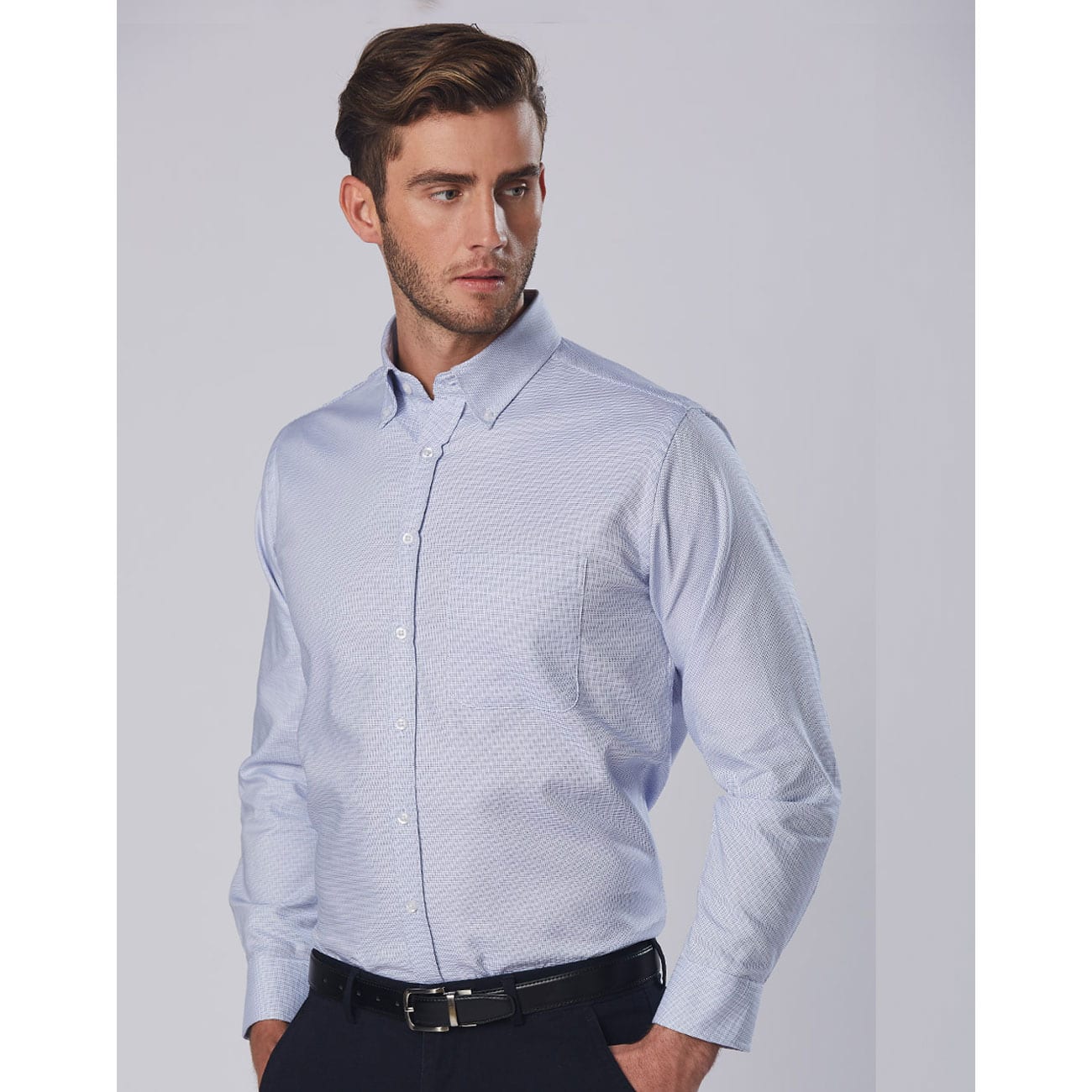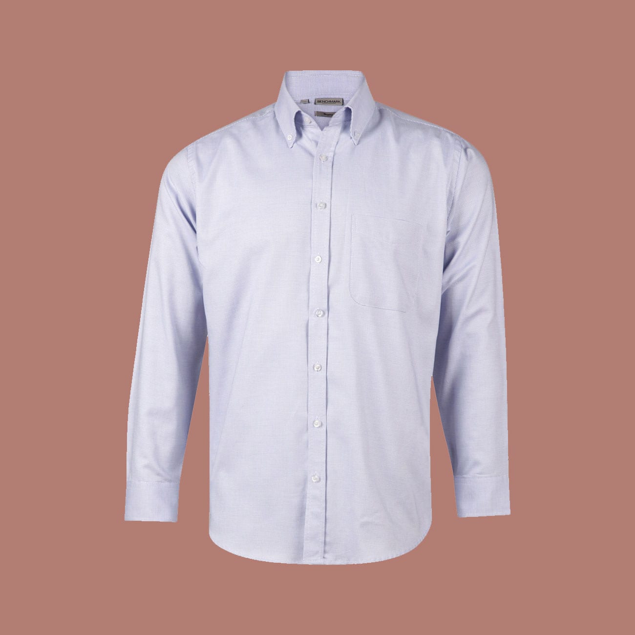 Adjustable round cuff. Mens have button-down collar and left chest pocket.
