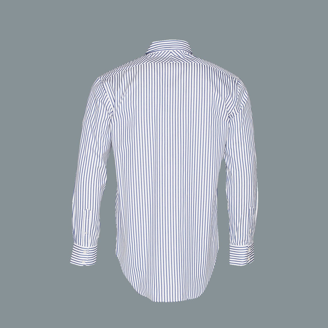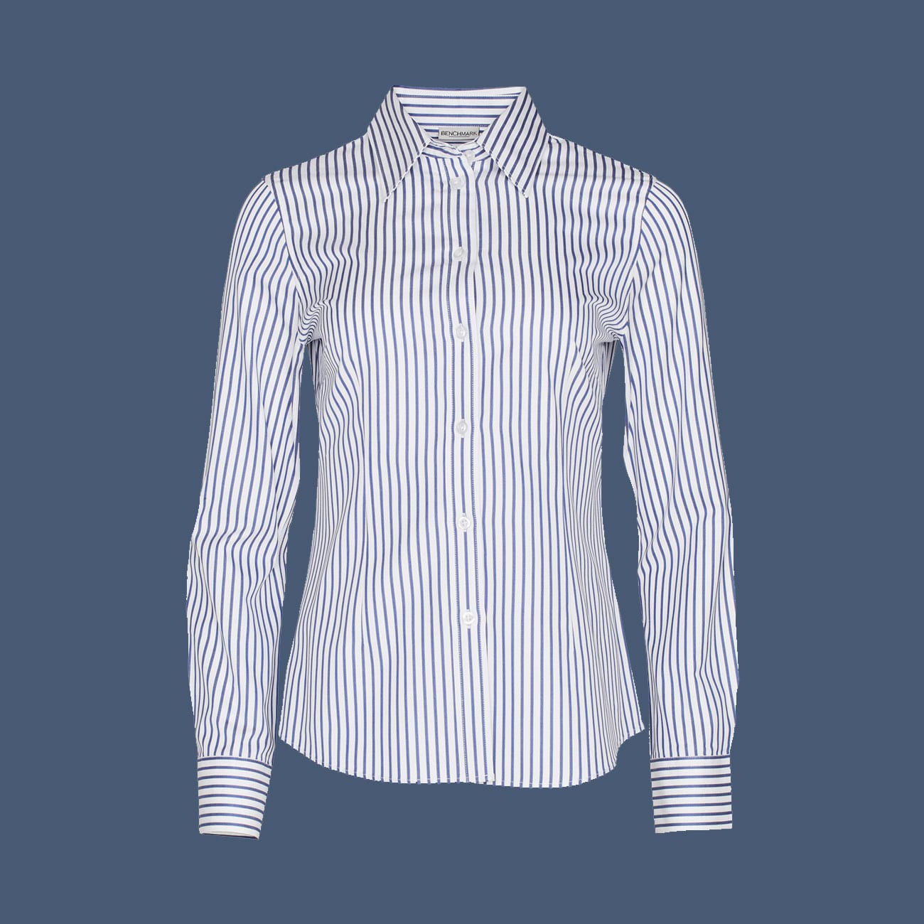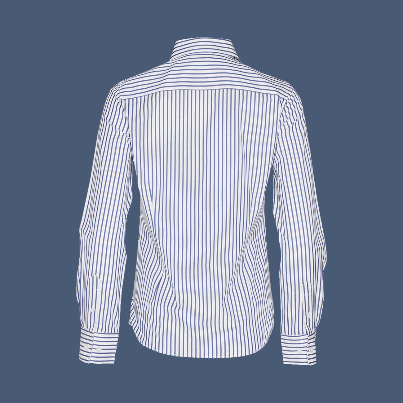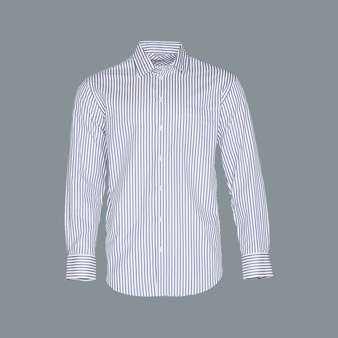 Modern collar with CF placket. Mens have doublebutton round cuffs and left chest pocket.