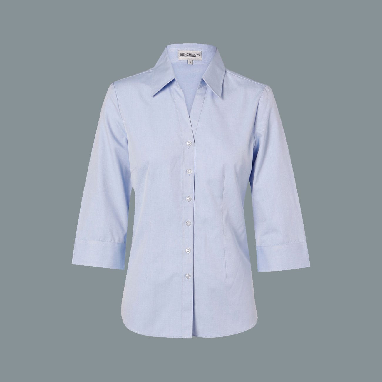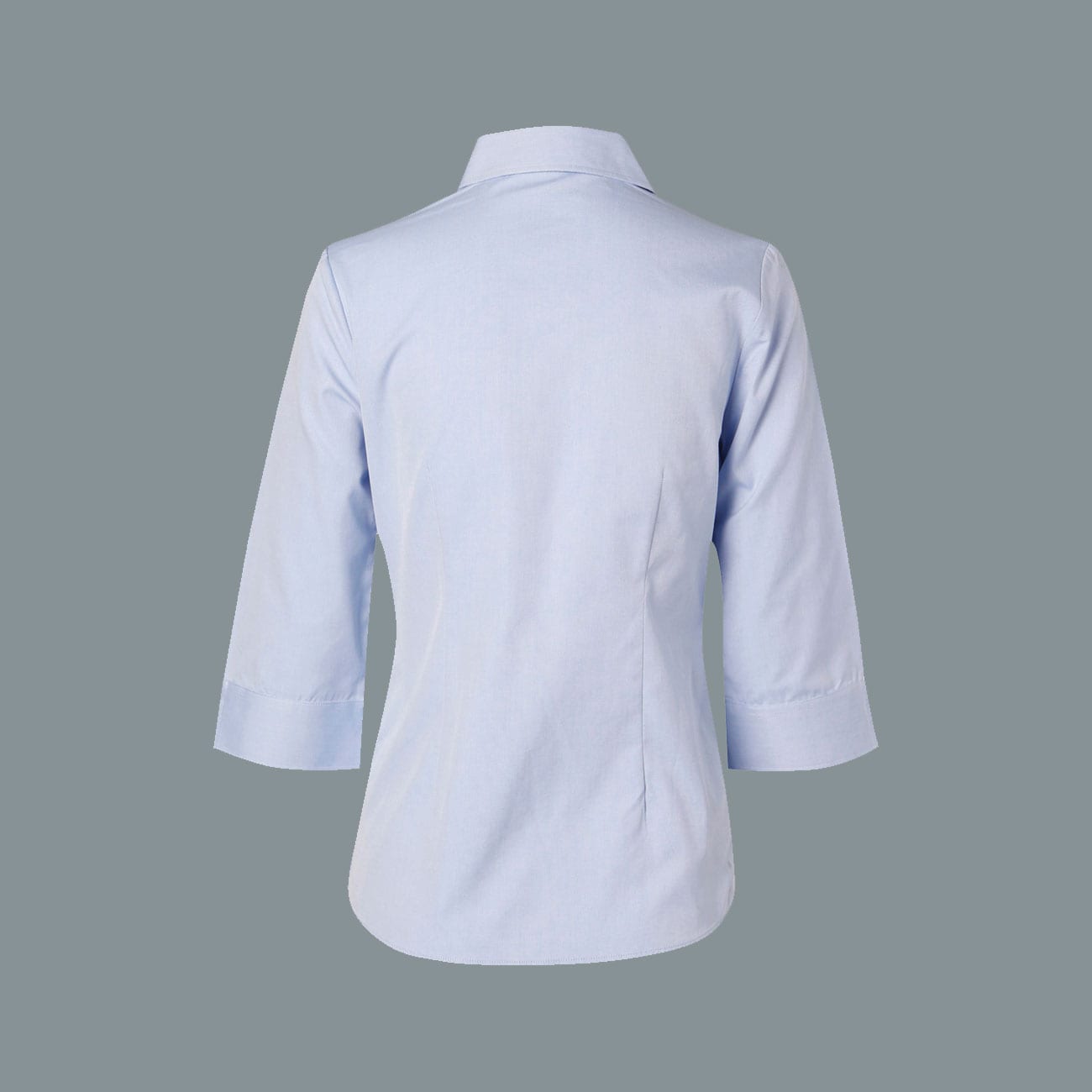 Regular collar. Mens have chest pocket. Ladies have open neck and back split cuff.