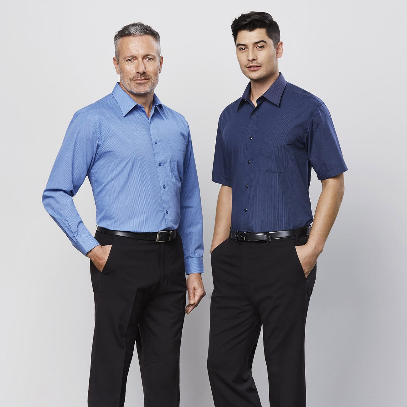 Modern collar, chest pocket, twin back pleats and adjustable cuff