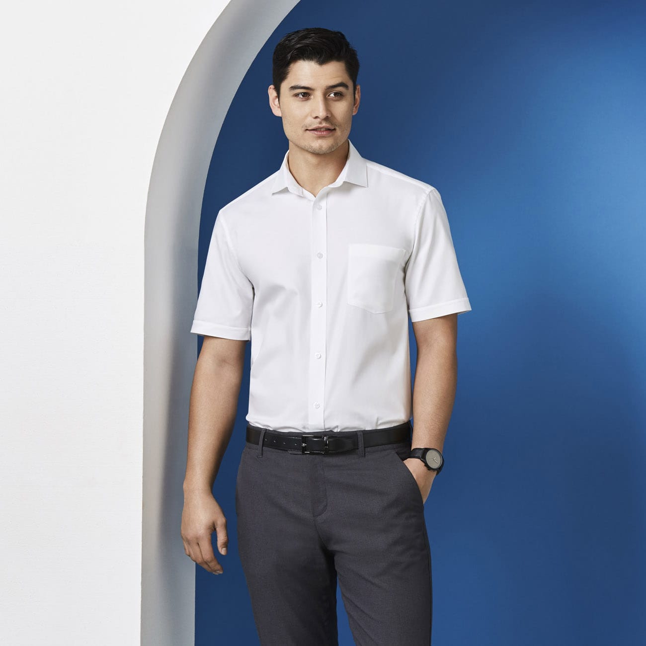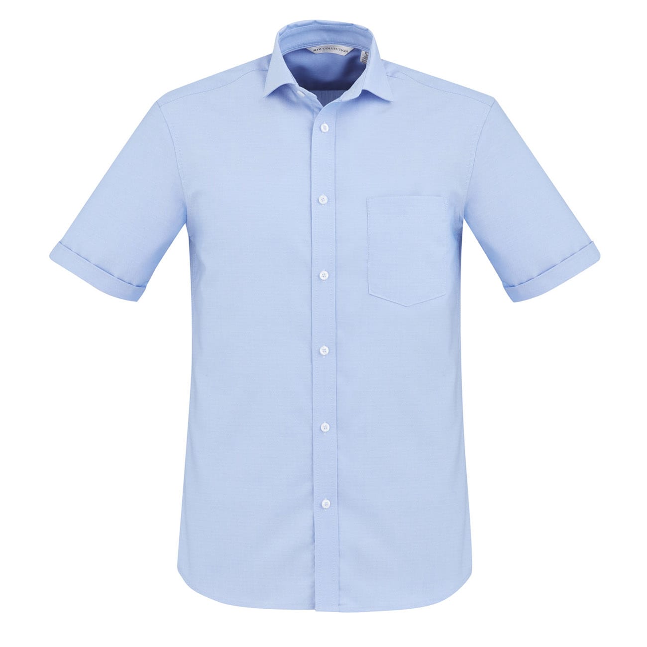 Mens features modern collar, chest pocket, twin back pleats and adjustable cuff