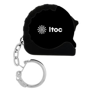 A mini tape measure keychain with a metal tape. Measures up to 1 metre. Metric and imperial measurements.