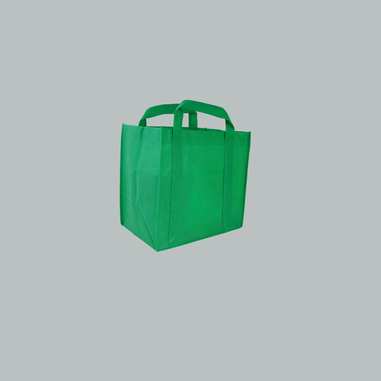 Large gusseted main compartment with plastic base board. Reinforced handles.