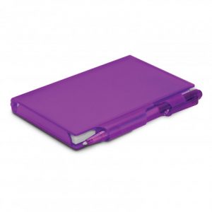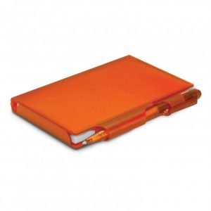 Pocket-size notebook in a compact plastic case which has a pen that locks the case closed when it is inserted in the pen holder.