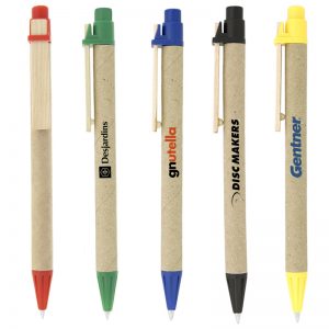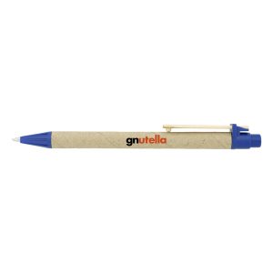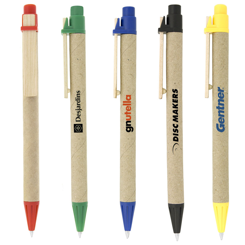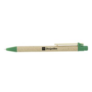 - A click action ballpoint pen made of recycled paper and features a wooden clip.