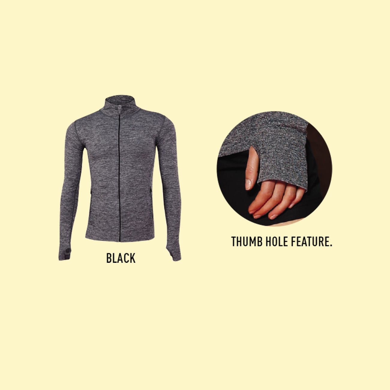 Front zipped pockets for storage and hand warmth. Thumb hole features for added warmth.
