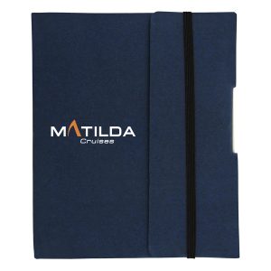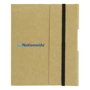 - Other features include a blank black ink pen made from recycled paper and an elastic band to keep the notebook closed.