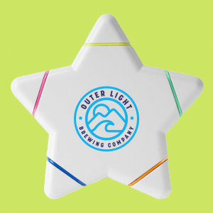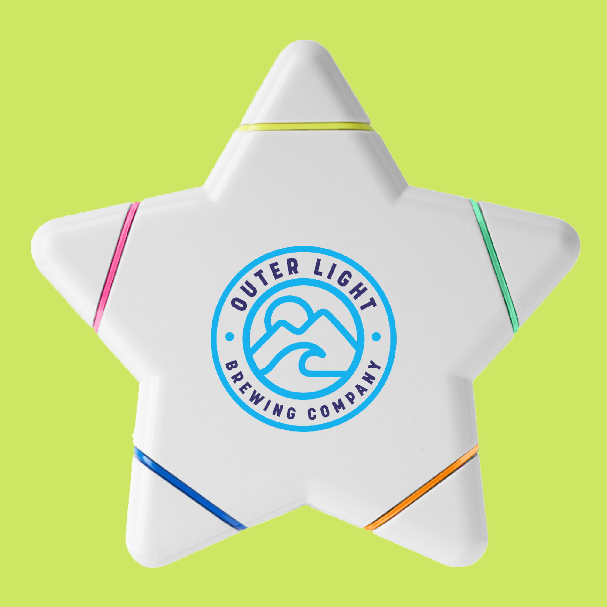 - A star shaped highlighter with 5 colour highlighters of yellow, pink, orange, blue and green,
