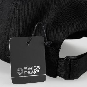 Swiss Peak’s deluxe six panel hat is made of a soft blend of 98% cotton and 2% spandex. The hat features an adjustable Velcro strap with a silicone pull tab, grey accents, and custom Swiss Peak bias tape interior. Available in one size to fit most people, the hat sports a reflective Swiss Peak logo and hang tag.