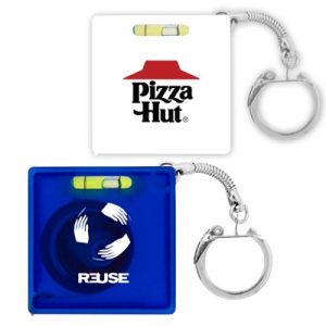 A tape measure with a level, metal tape, square shape and a keychain. Measures up to 1 metre. Metric and imperial measurements.