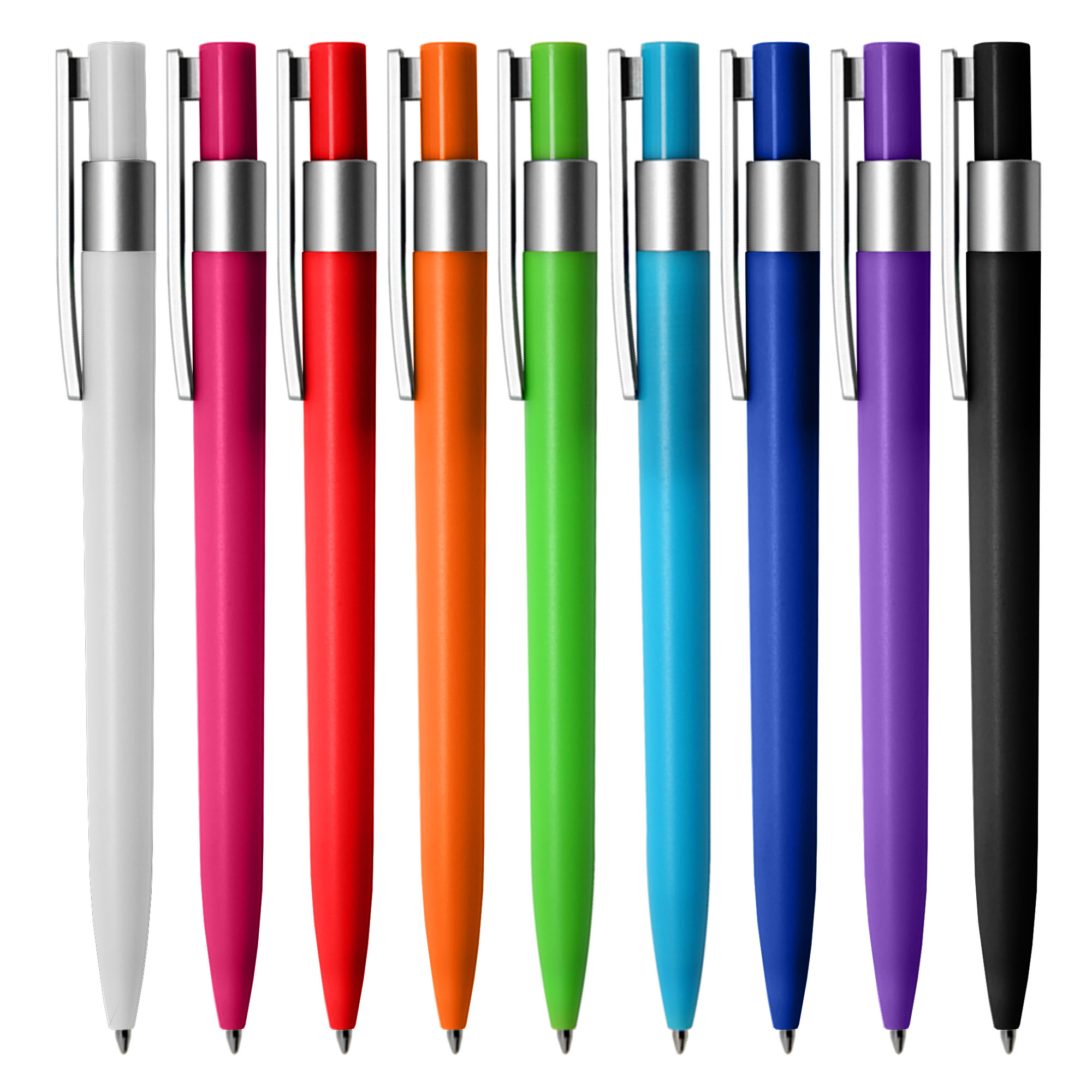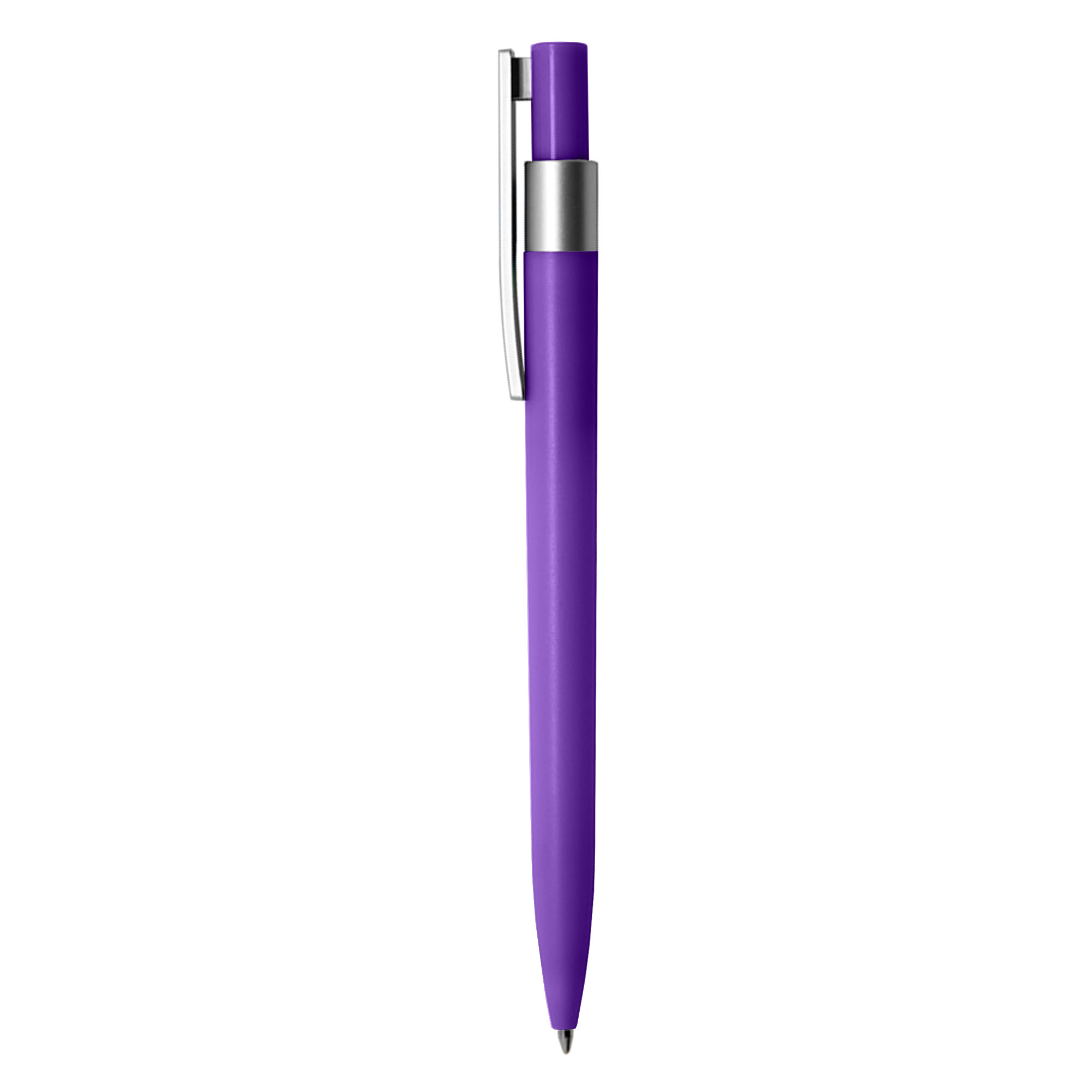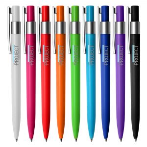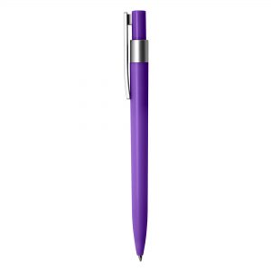 - Coloured plastic pen with frosted finishing, a silver clip and a top ring.