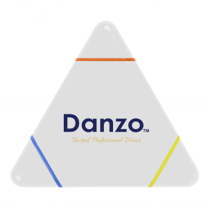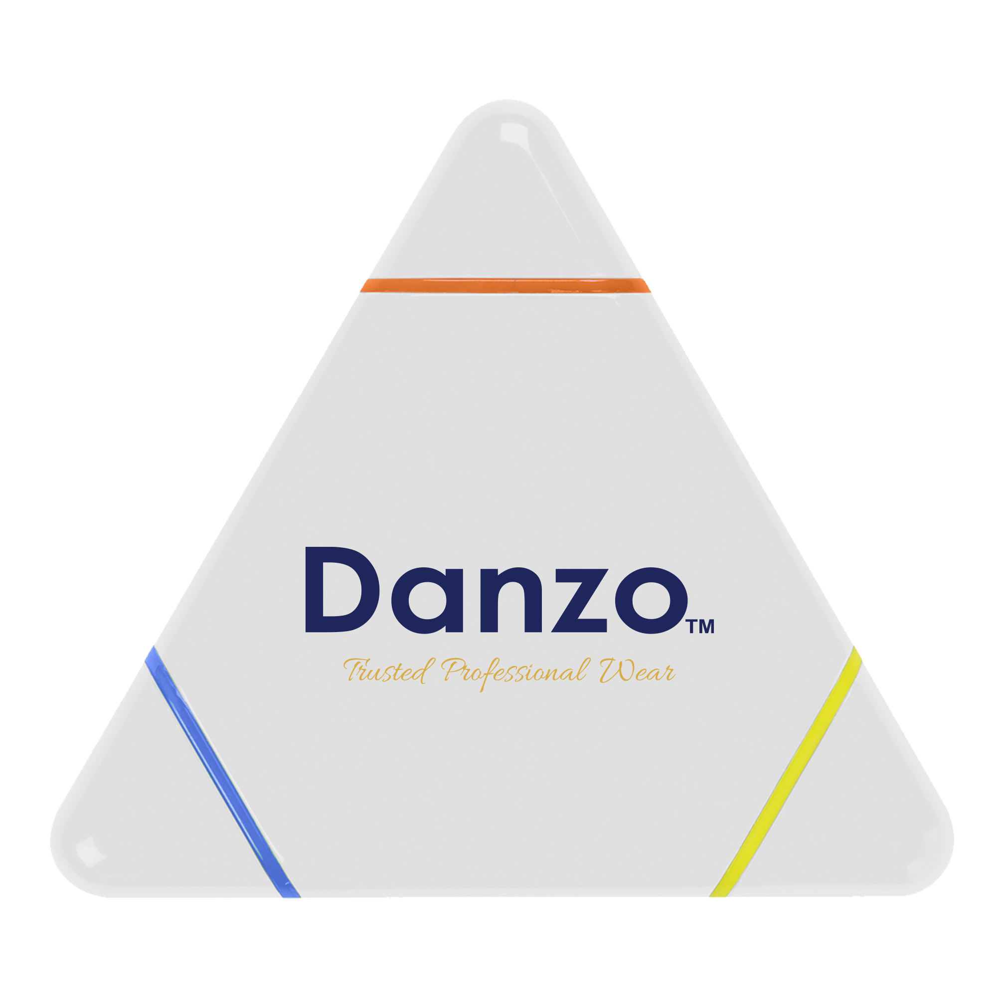 Triangle shaped highlighter with a set of orange, yellow and blue highlighters,