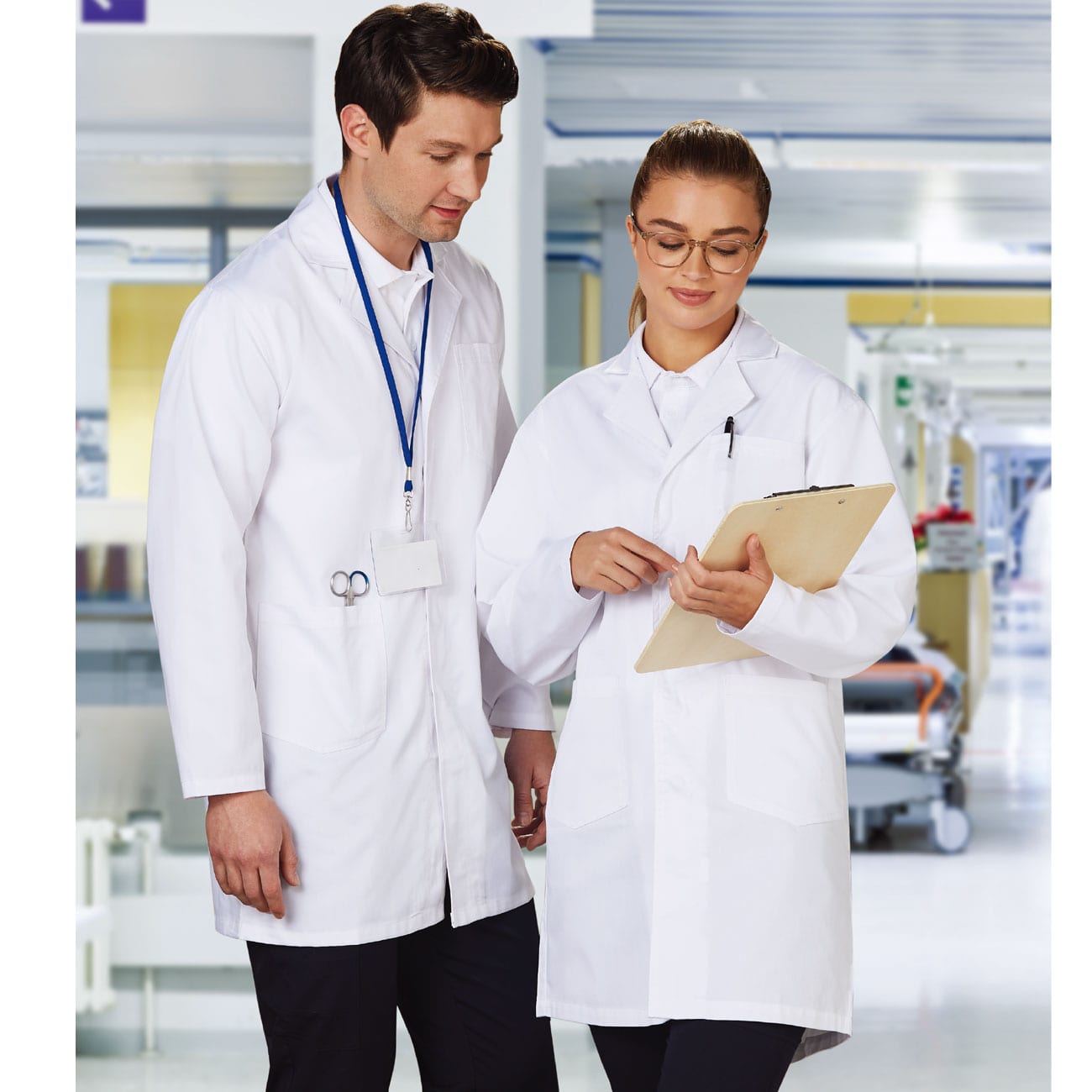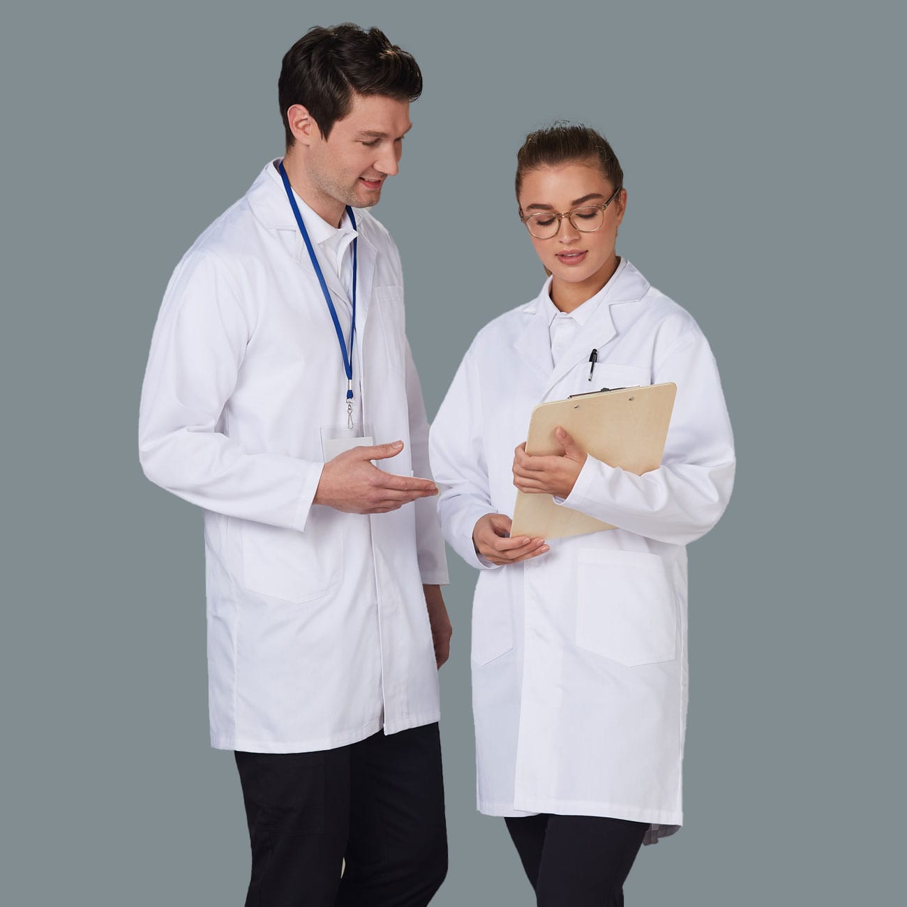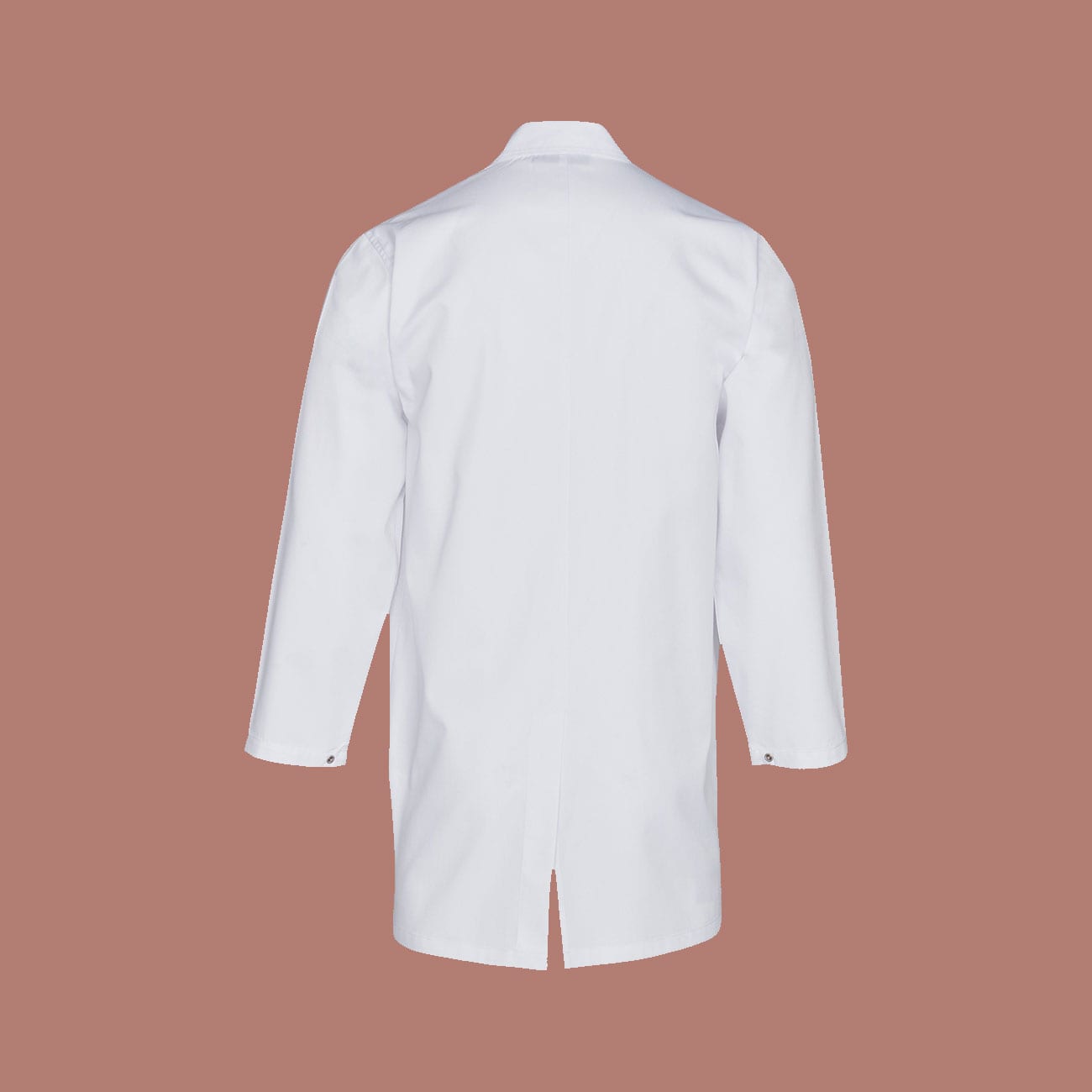 Concealed stud buttons front, two lower pockets, one chest pocket with pen partition, back centred vent.