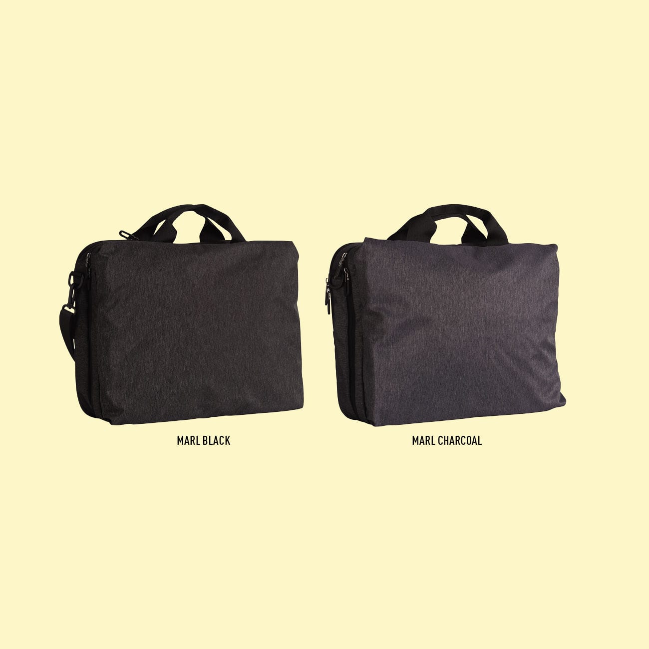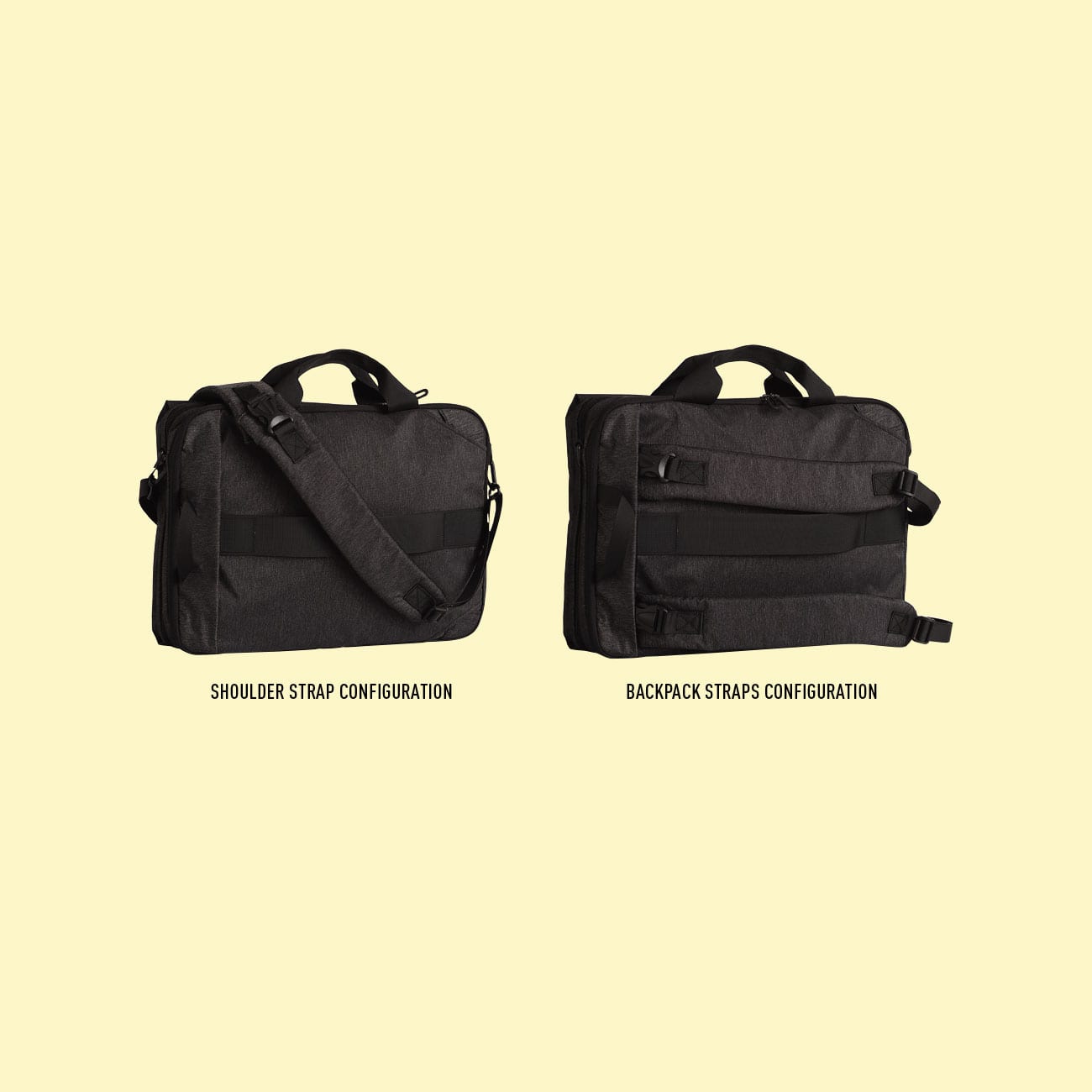 The front has one zip compartment containing attachments for straps to covert to back pack.