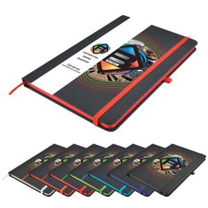 PU A5 Notebook with matching colour elastic retaining closure, ribbon page maker, pen loop and coloured edged pages.