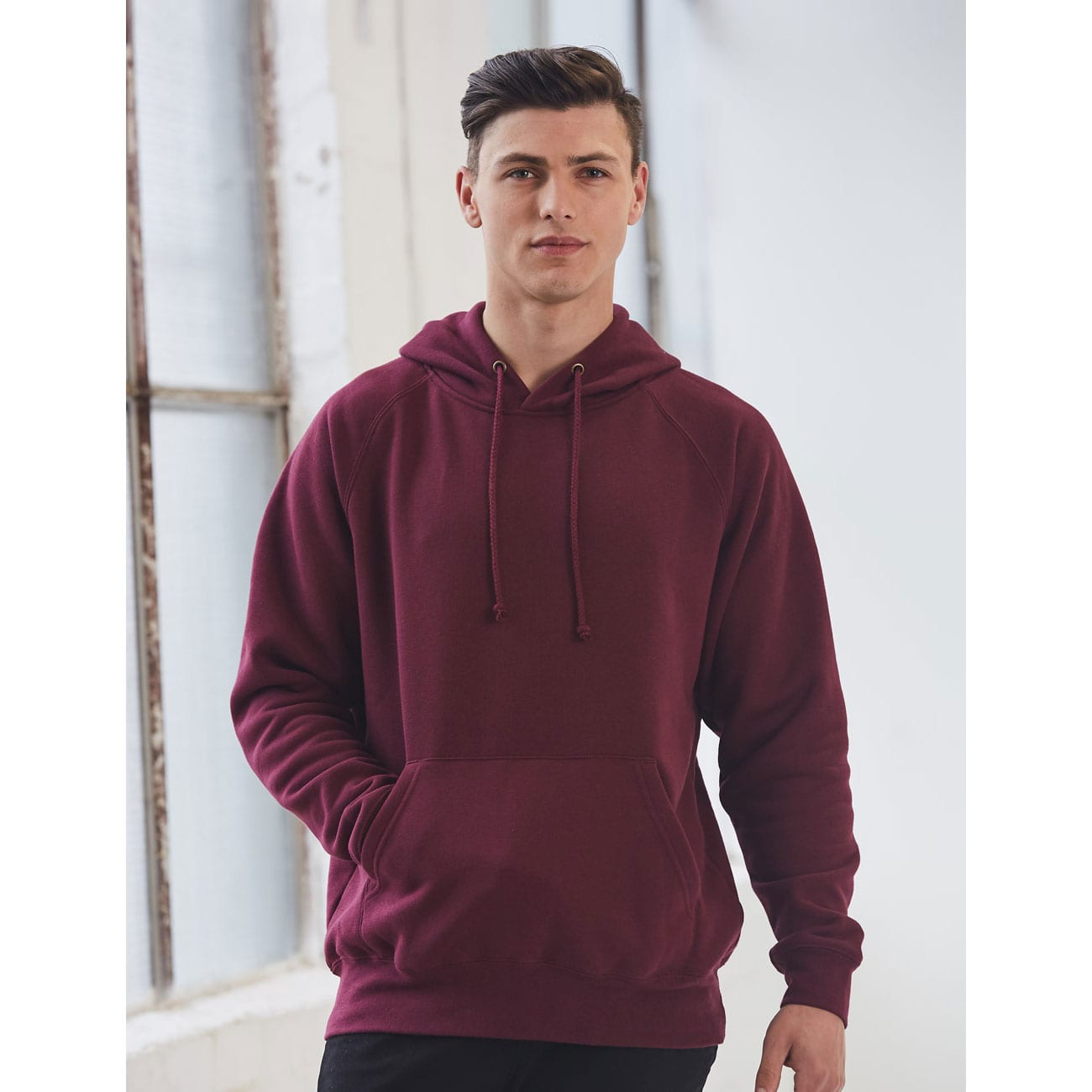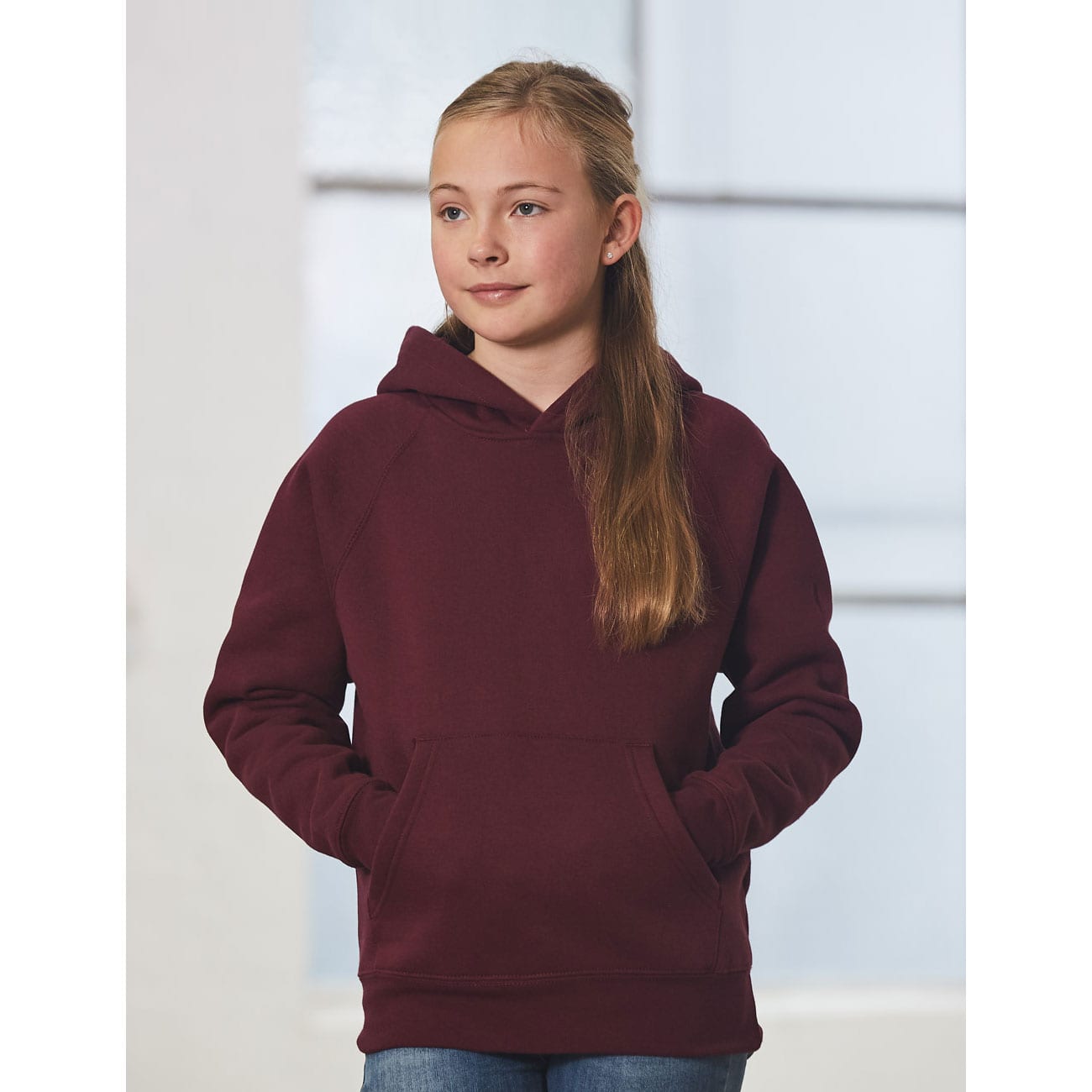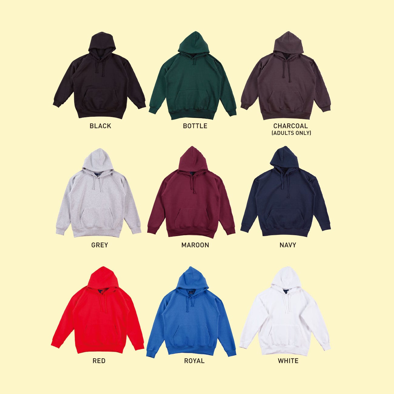 A traditional fleece hoodie. Closed front with kangaroo pocket.