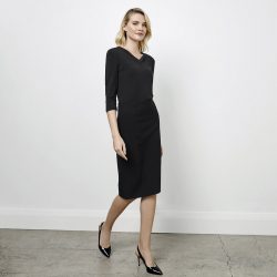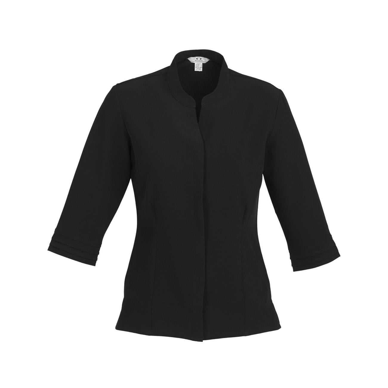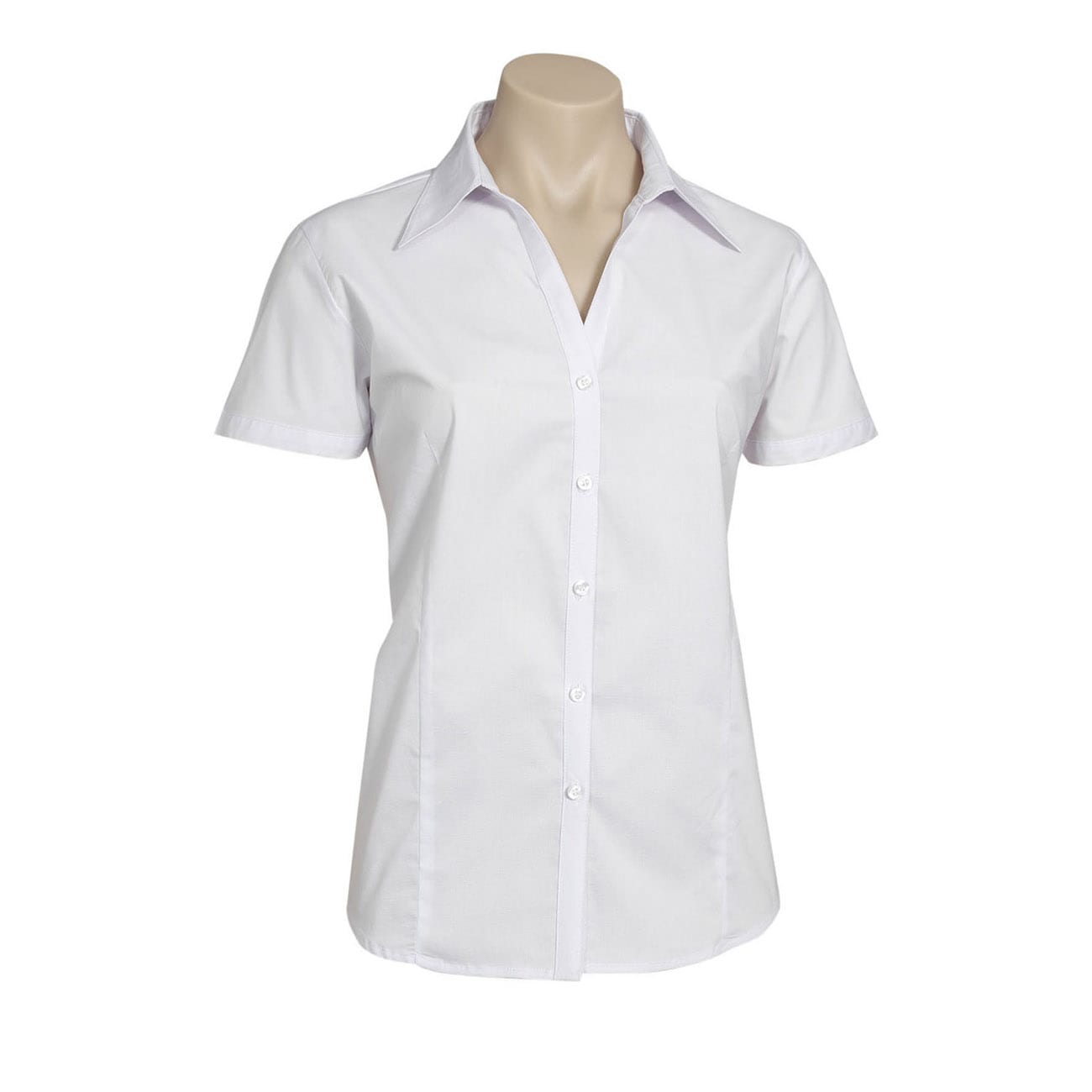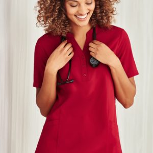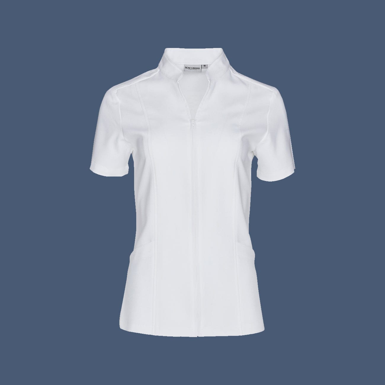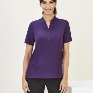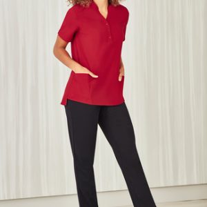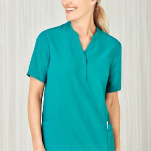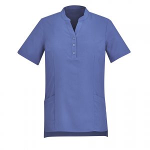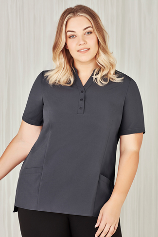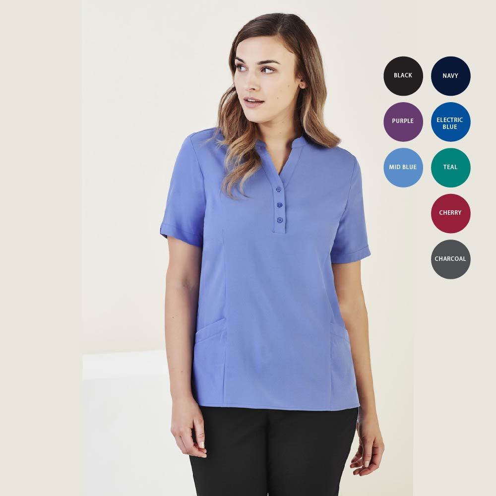 Style features longer hem lengths, short sleeve with cuff detailing, side splits and 2x front pockets